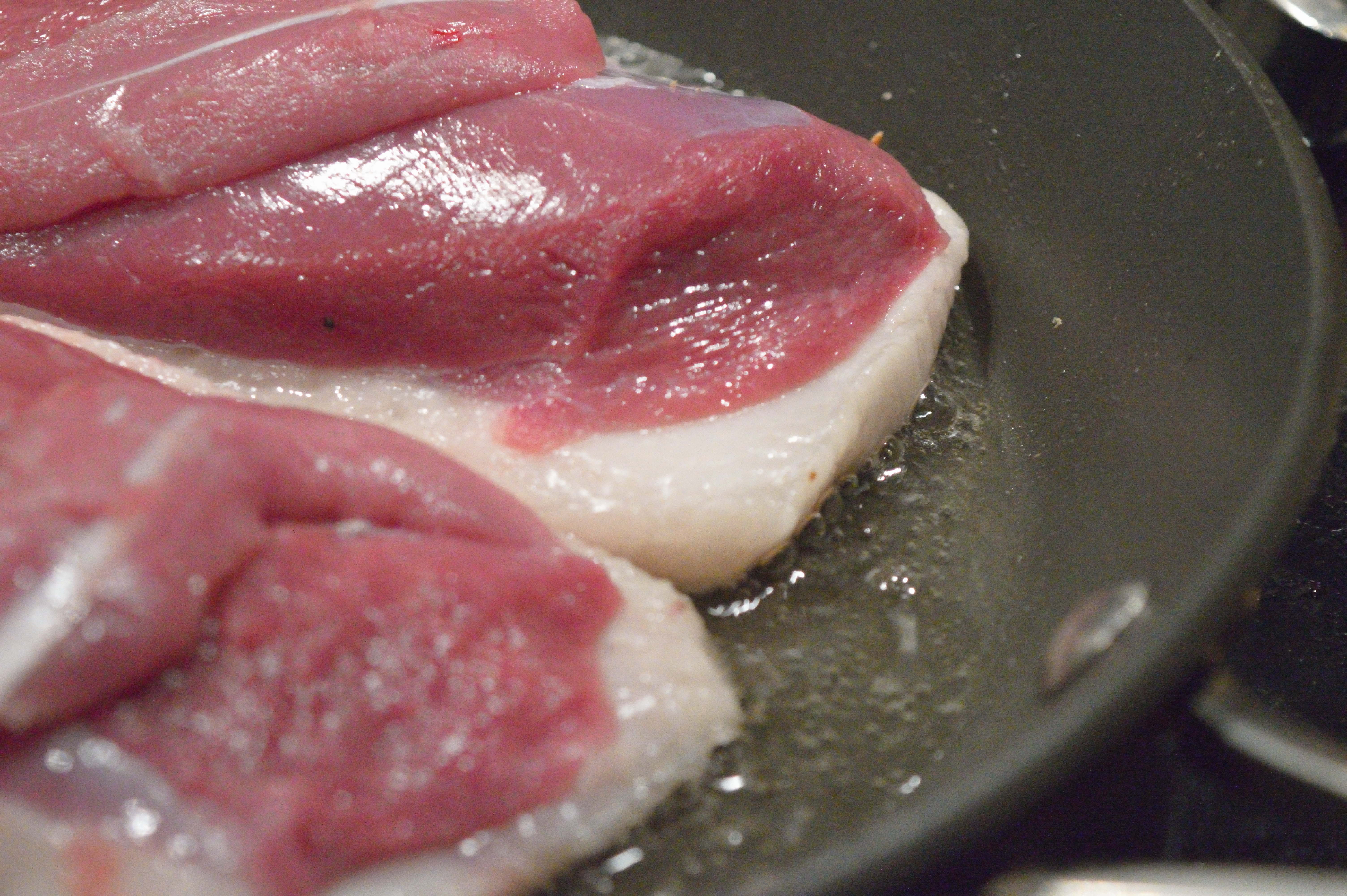 Put an ovenproof frying pan, just big enough for your breasts (harhar), onto a highish-medium heat (number 6 on my hob). Lay the duck skin side down in the pan.