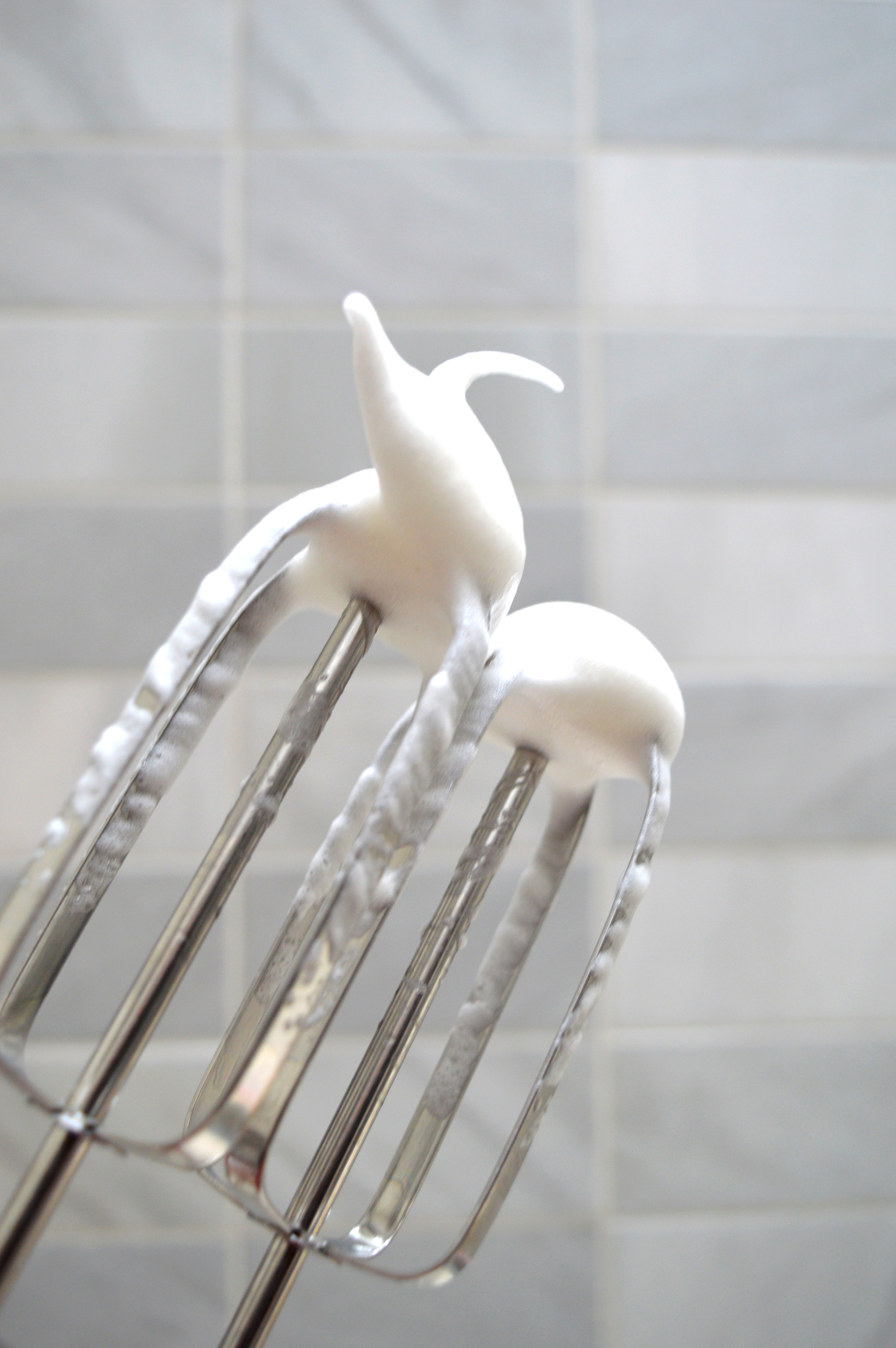 Preheat the oven. Line a baking tray with baking parchment. Whisk the egg whites to firm peaks, see the photo below. This is when the mixture starts to look a little dry and if you want to be like one of those annoyingly excitable cooks on tv you can hold it over your head and you shouldn’t look like you got on the wrong side of a disgruntled seagull.