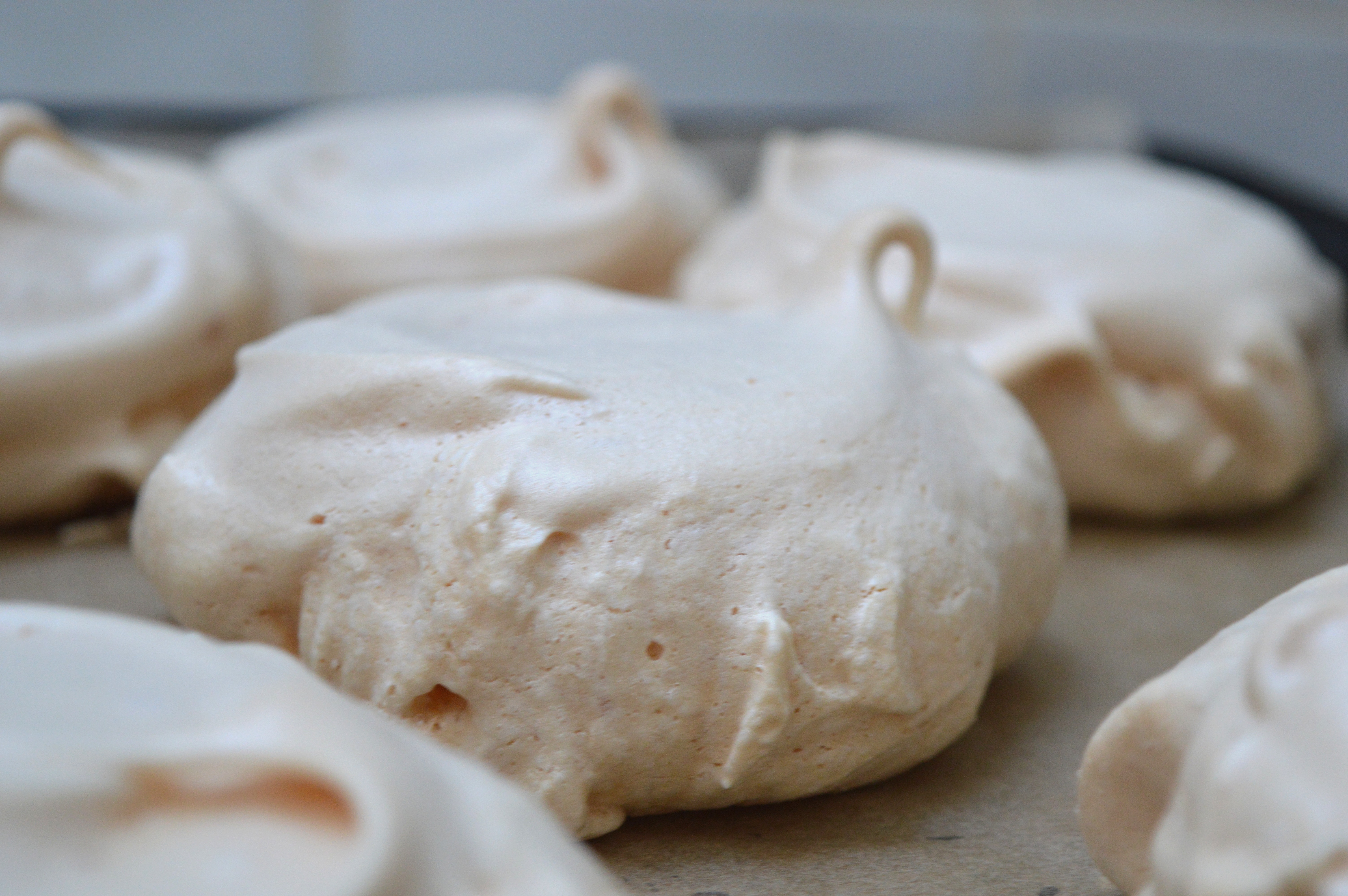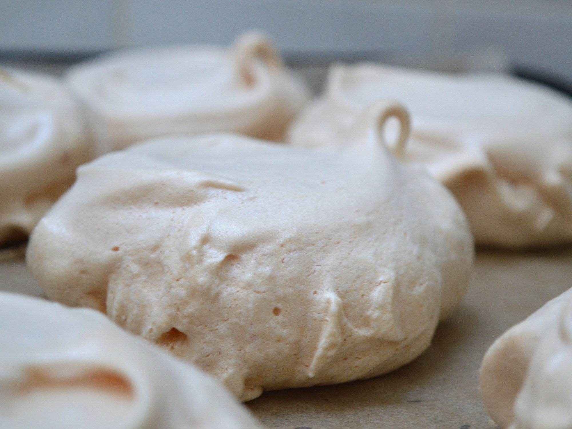 You can pipe the mixture if you want to show off but it’s much easier to use two dessert spoons. Scoop up a very heaped spoonful of the meringue goo on the first spoon and scrape it off, onto the prepared baking tray, using the second spoon. Keep going till all the mixture is happily doled out. If there are any pointy bits on the little meringue mounds, dip your finger in some water and squish the peak down so it’s more or less flat.