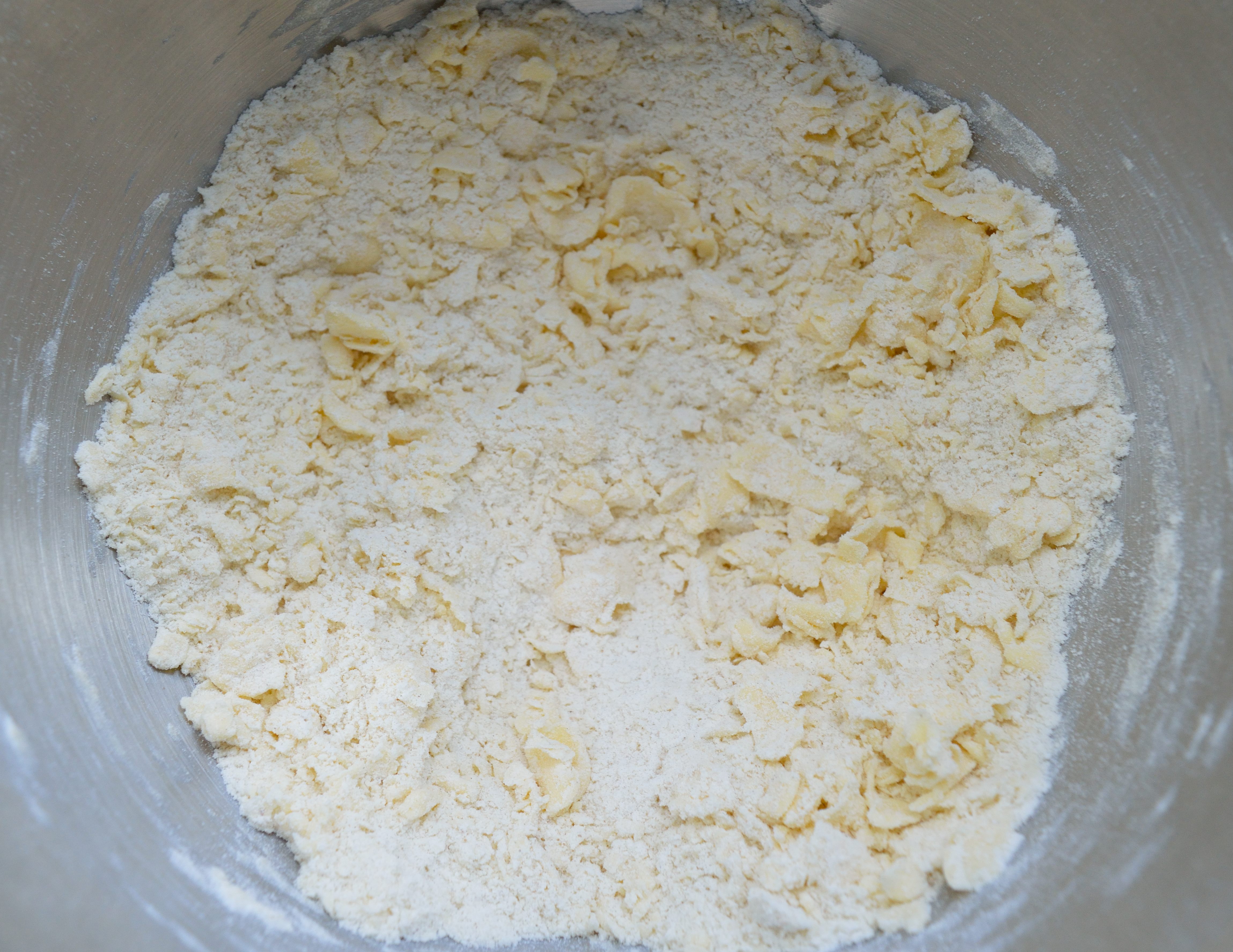 If using your hands, which I usually do but this time felt a little lazy, put the flour, butter, sugar and salt into a bowl and rub to form ‘breadcrumbs’ – see below.