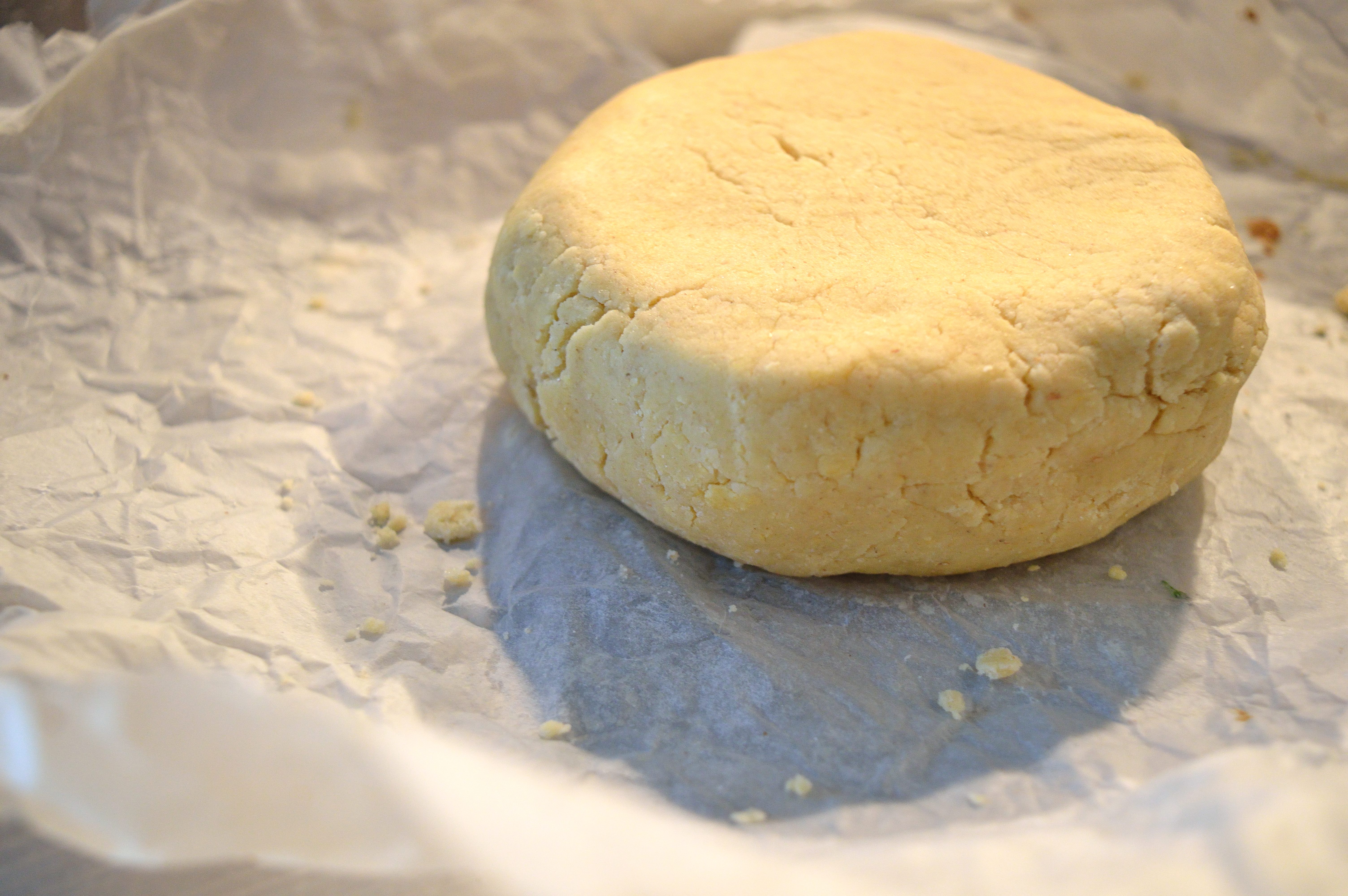 Now, add in the egg yolk and the water. Make a claw with one hand and begin to cover the liquids with the floury stuff. This is in an effort to bring the dough together without it all sticking to your hand. Work it lightly until you get a smooth mix. Roll it into a ball and then flatten. Wrap it in clingfilm or greaseproof paper and pop it in the fridge.