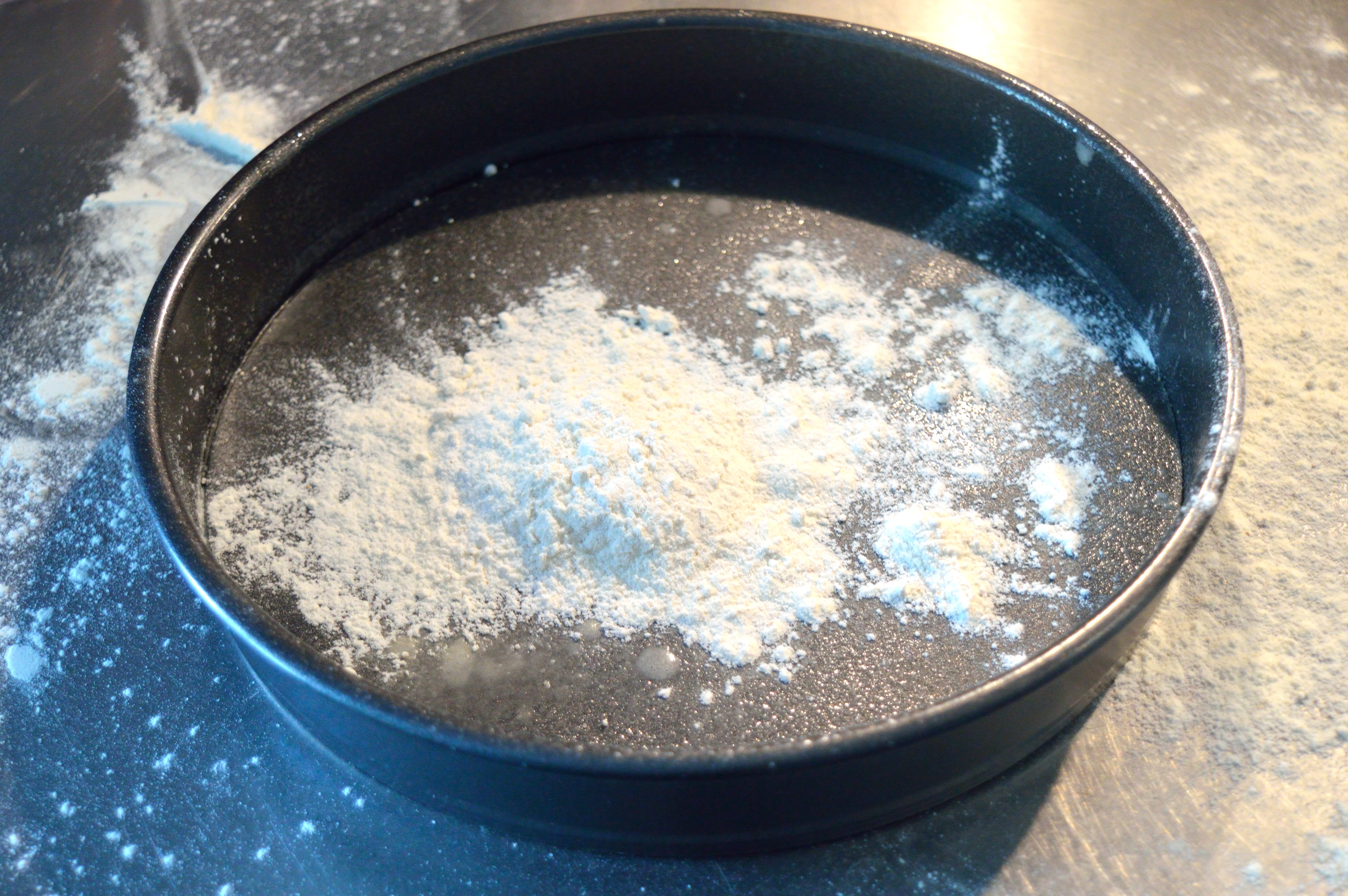 With pastry you have to grease the tin differently to your standard cake. First rub all the interior surfaces with soft butter, if you have the non-stick spray use that. Then put a handful of plain flour into the centre and begin to rotate the tin so the flour falls, and coats, all of the inside (the pictures below might make it a bit clearer). Pop the tin out of the way.
