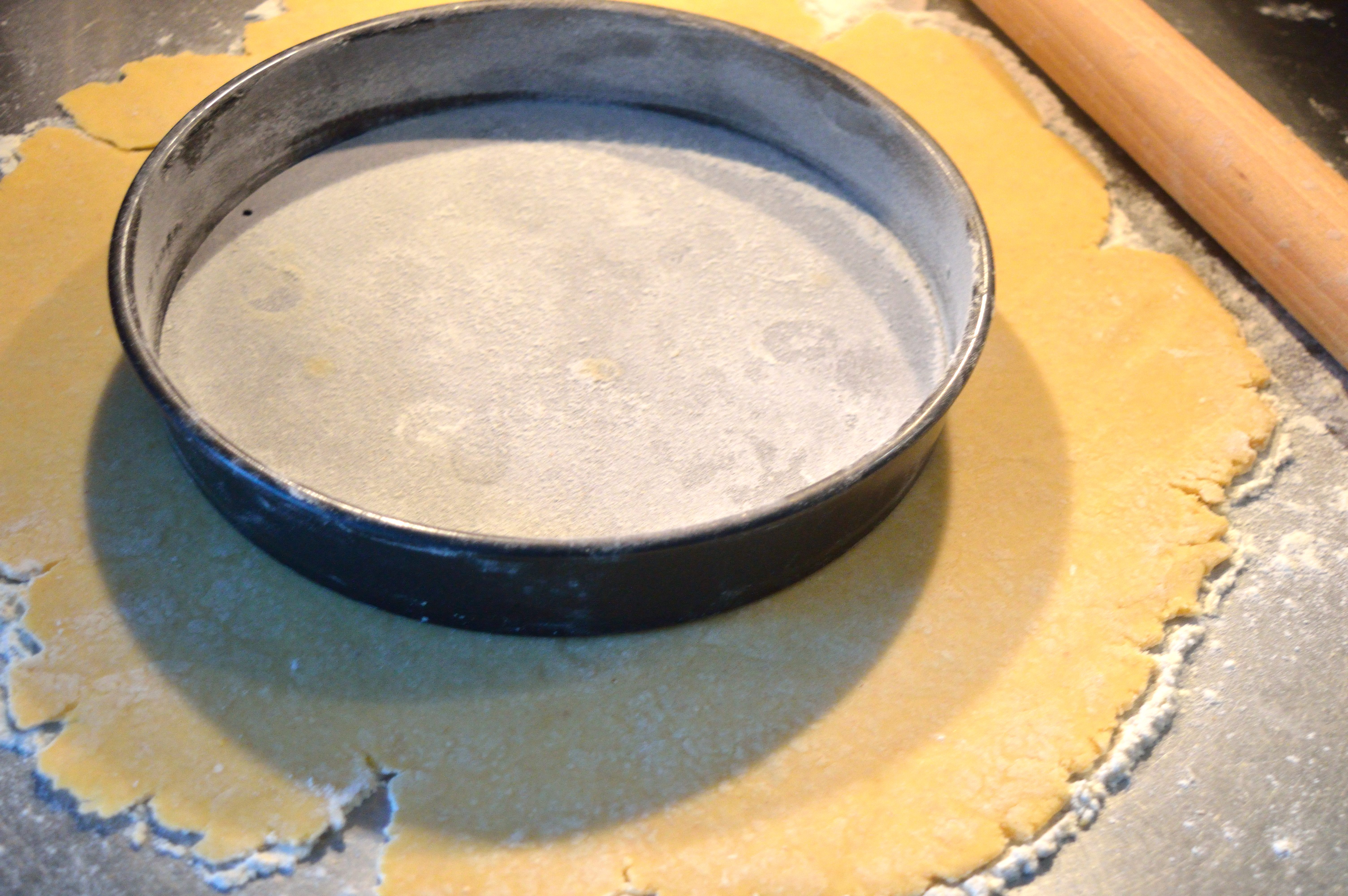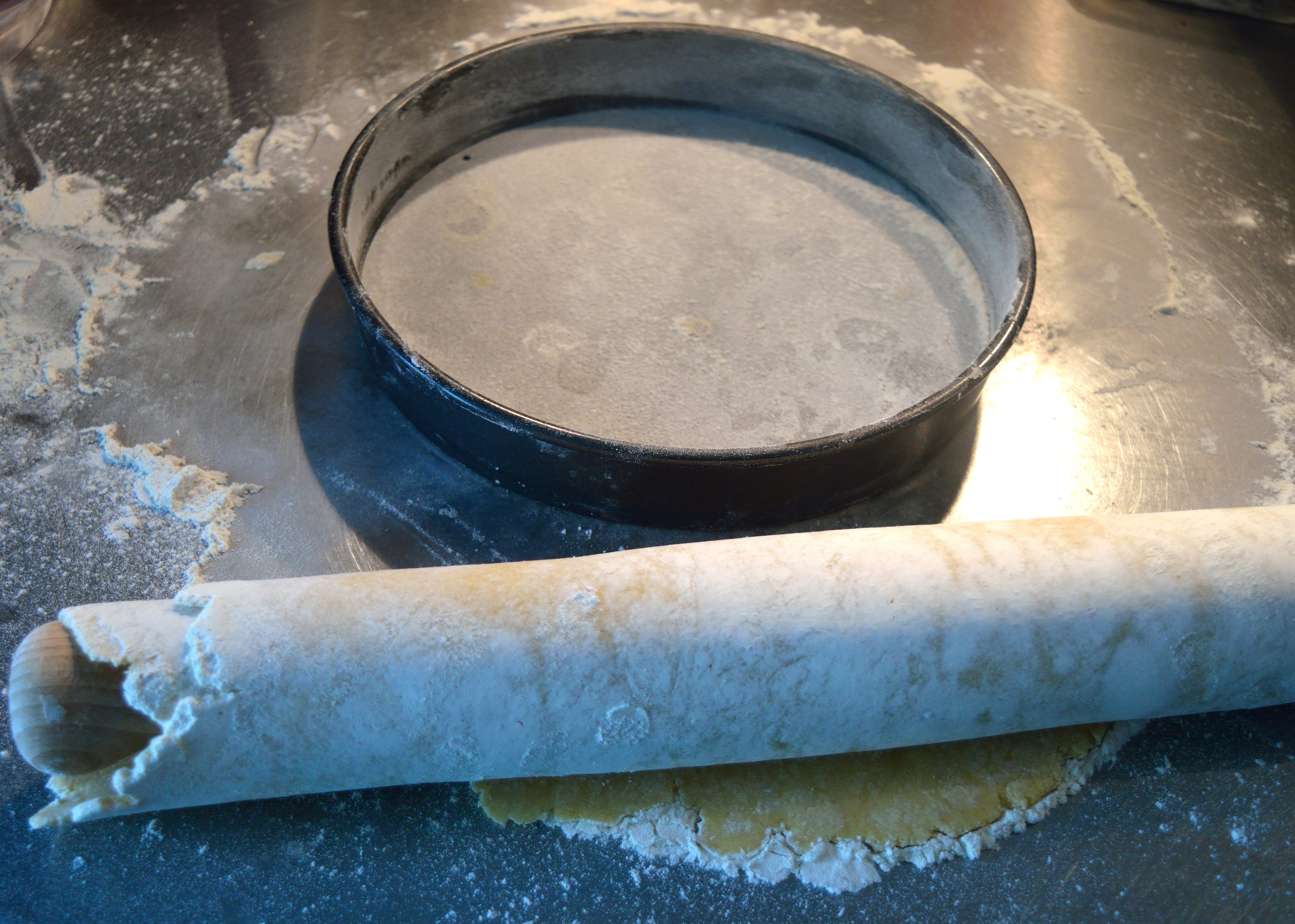 You’ll be wanting the pastry to be about a euro coin thick. Run your hand across the top of the pastry to make sure it’s all about the same thickness. Another important consideration is how big your pastry needs to be. Roll it out to about the size you think you’ll need then put the greased tin on top of it in the centre. If there is enough pastry to cover the bottom and come up all of the sides then good work otherwise take the tin off and roll a bit more.