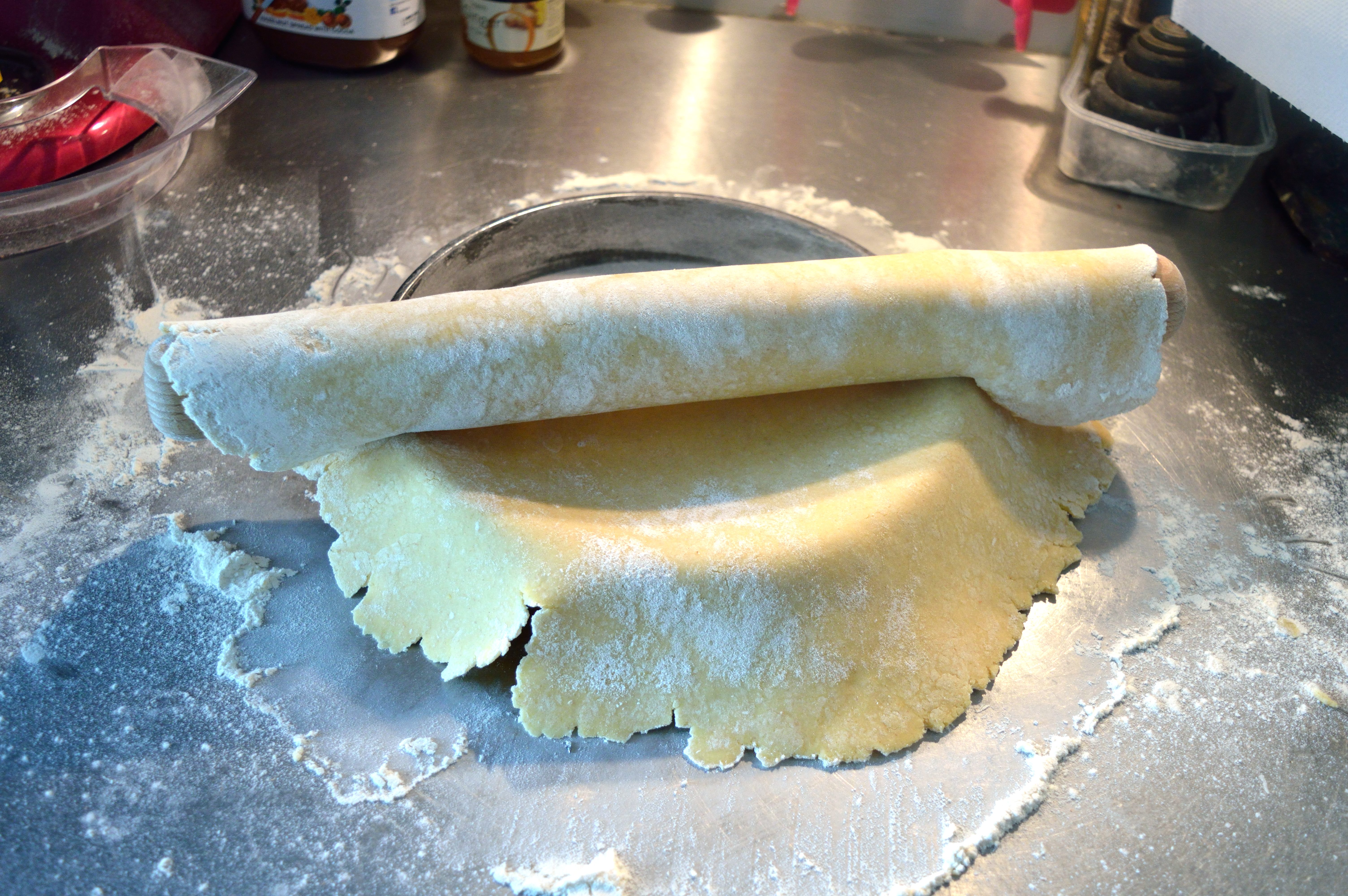 Now to roll the pastry. Remove it from the fridge and squish it with your hands for a few seconds to take the chill off it. Dust the work surface with flour and place the pastry lump on top. Flour your rolling pin lightly. Roll the pastry in one direction for a few seconds then lift up the pastry, flour the surface a little more and put the pastry back down 90degrees to how it was. Roll a little more, rotate another 90degrees but only flour if it’s starting to stick. You may need to flour the rolling pin again.