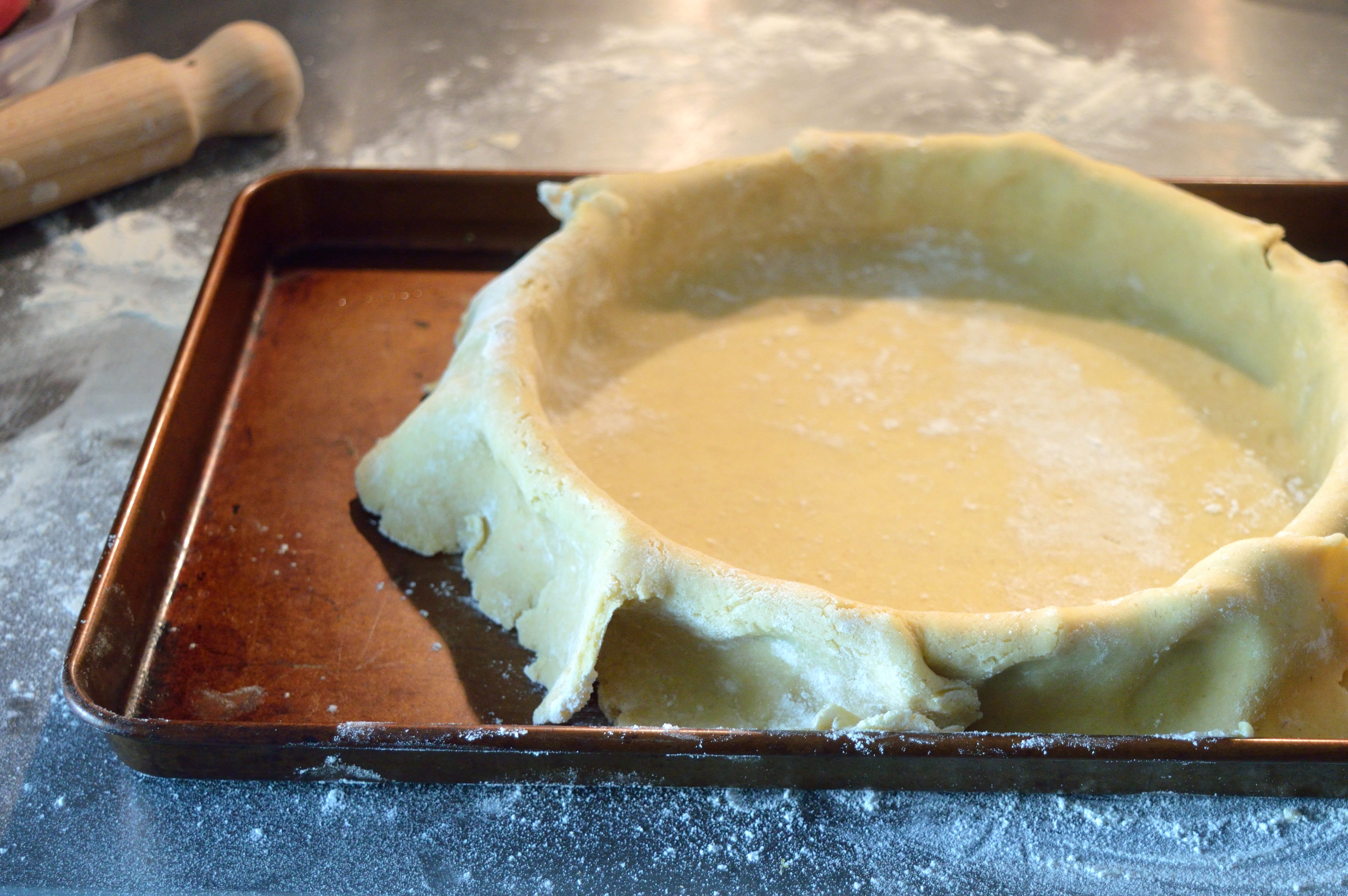 Begin to pick up the outside edge of the pastry and gently press the pastry into the corners of the tin. Do this the whole way around. You’ll have a little skirt of pastry but leave it be.
