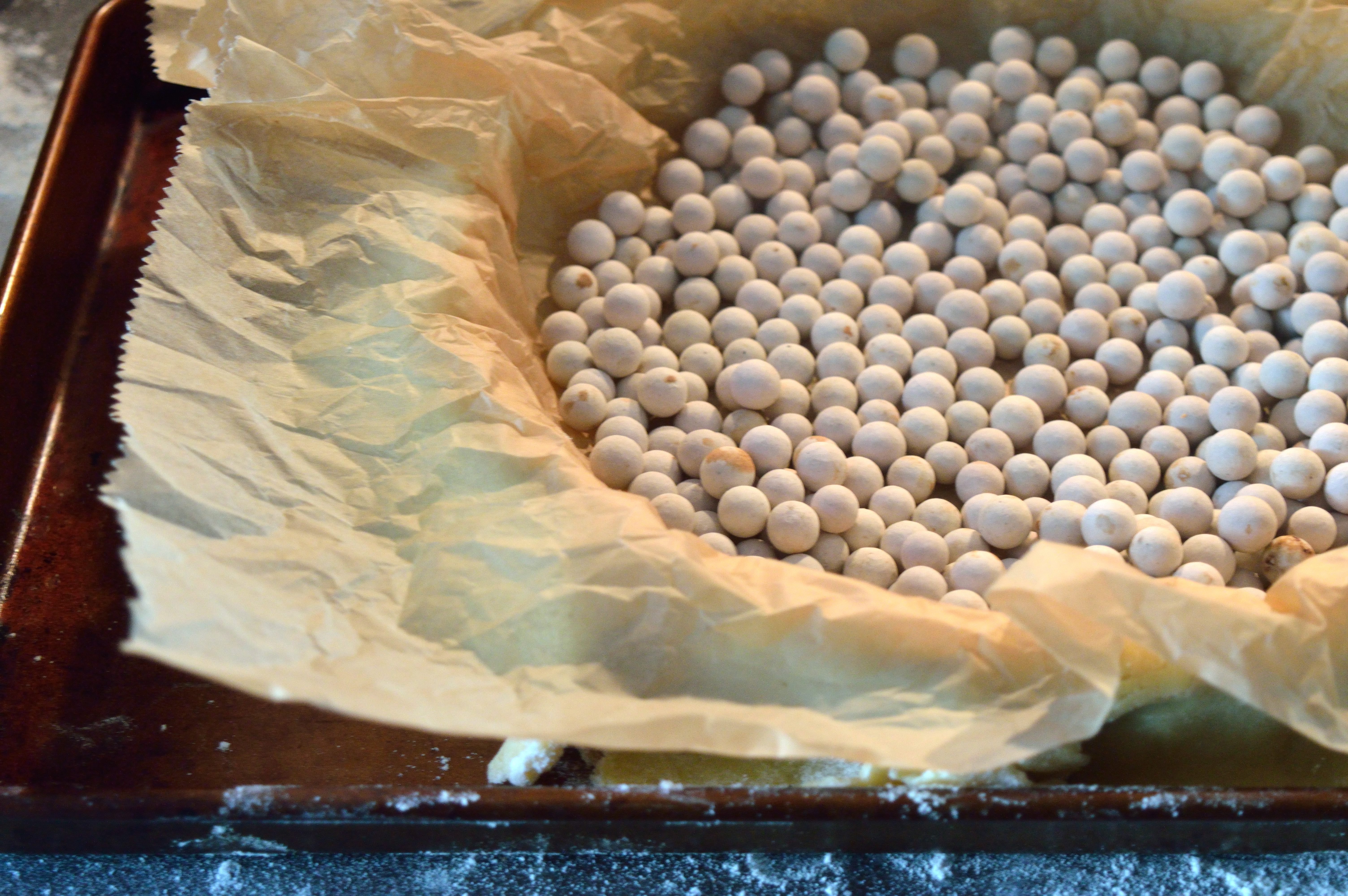 Place the pastried tin on a baking sheet. Using a fork pierce the base of the pastry about ten times. Tear off a piece of baking parchment big enough to cover the whole tin and scrunch it into a ball (this allows it to lie more neatly in the case), then unfurl and place on the pastry. If you have baking beans use them otherwise use rice to weigh down the parchment. This should stop the pastry from rising and going peculiar on you.