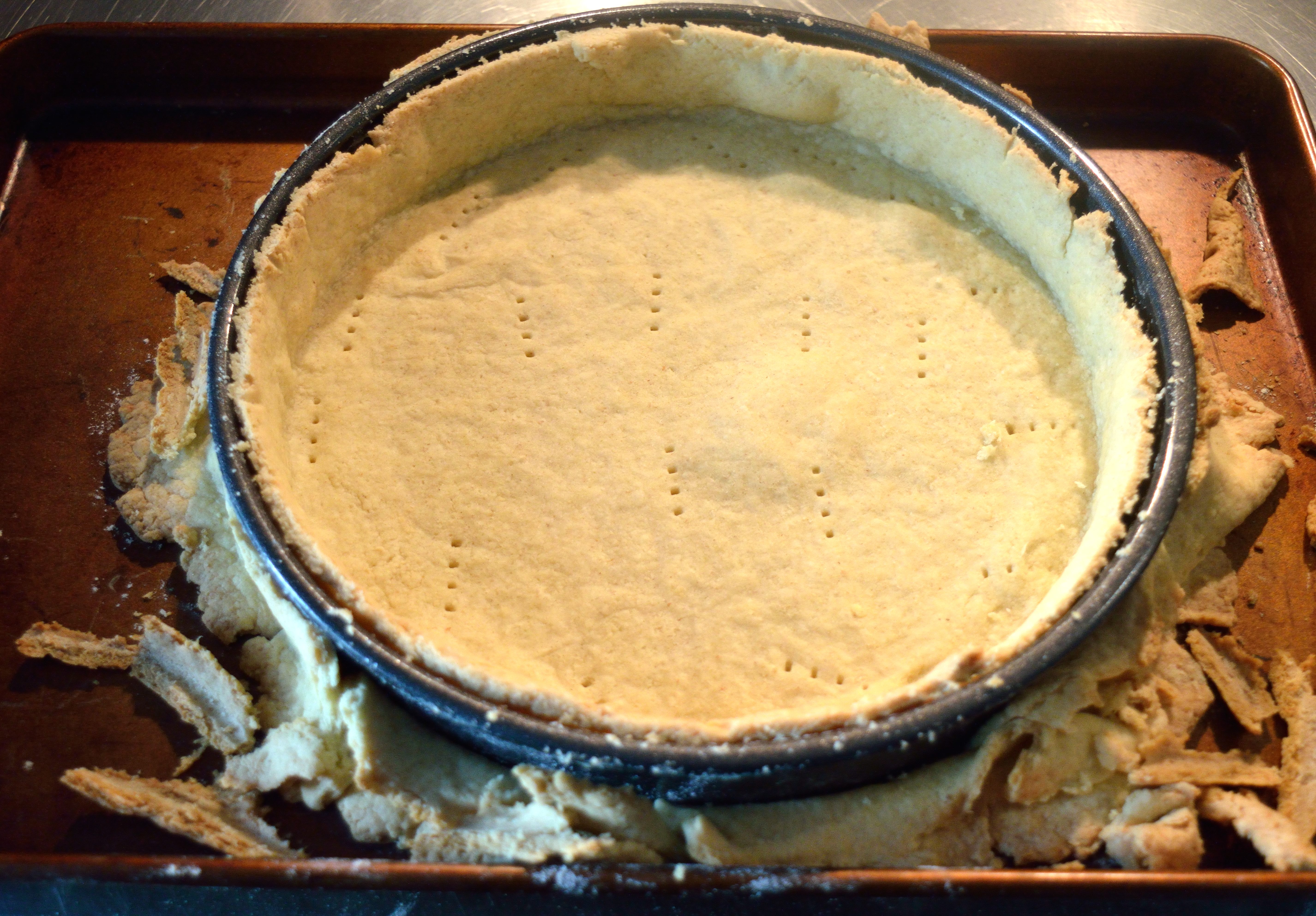 Pop it into the oven for 12mins. Remove from the oven and carefully take off the parchment and whatever weight you used. Use a sharp knife to cut off the excess pastry and neaten up the top edge of the pastry case.