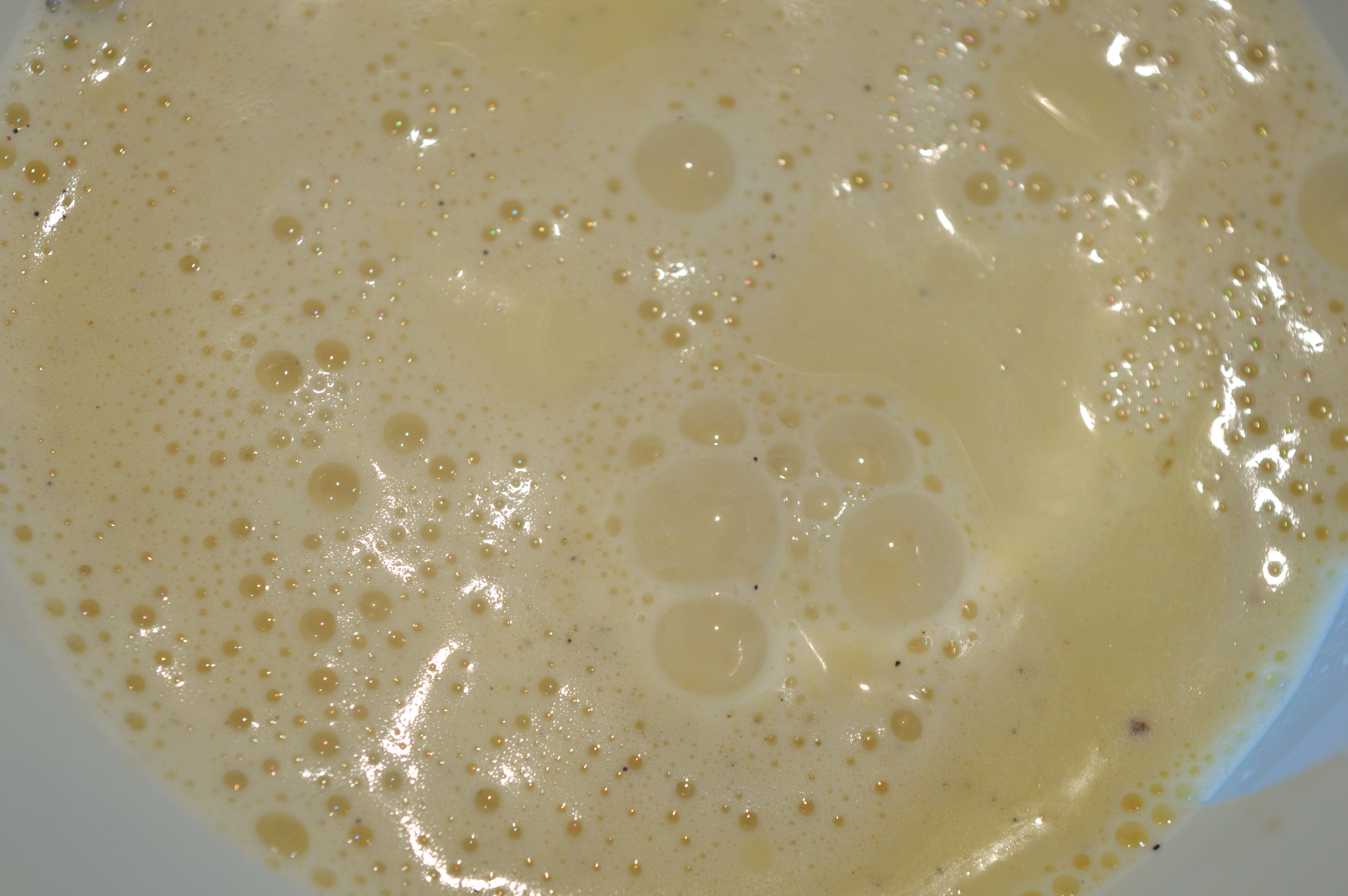 Once the cream concoction had reached sufficient bubbliness remove it from the heat and if you used a vanilla pod fish that out before pouring the mixture into a jug. Many recipes suggest letting it infuse for at least 15mins but you know my thoughts on such patience.