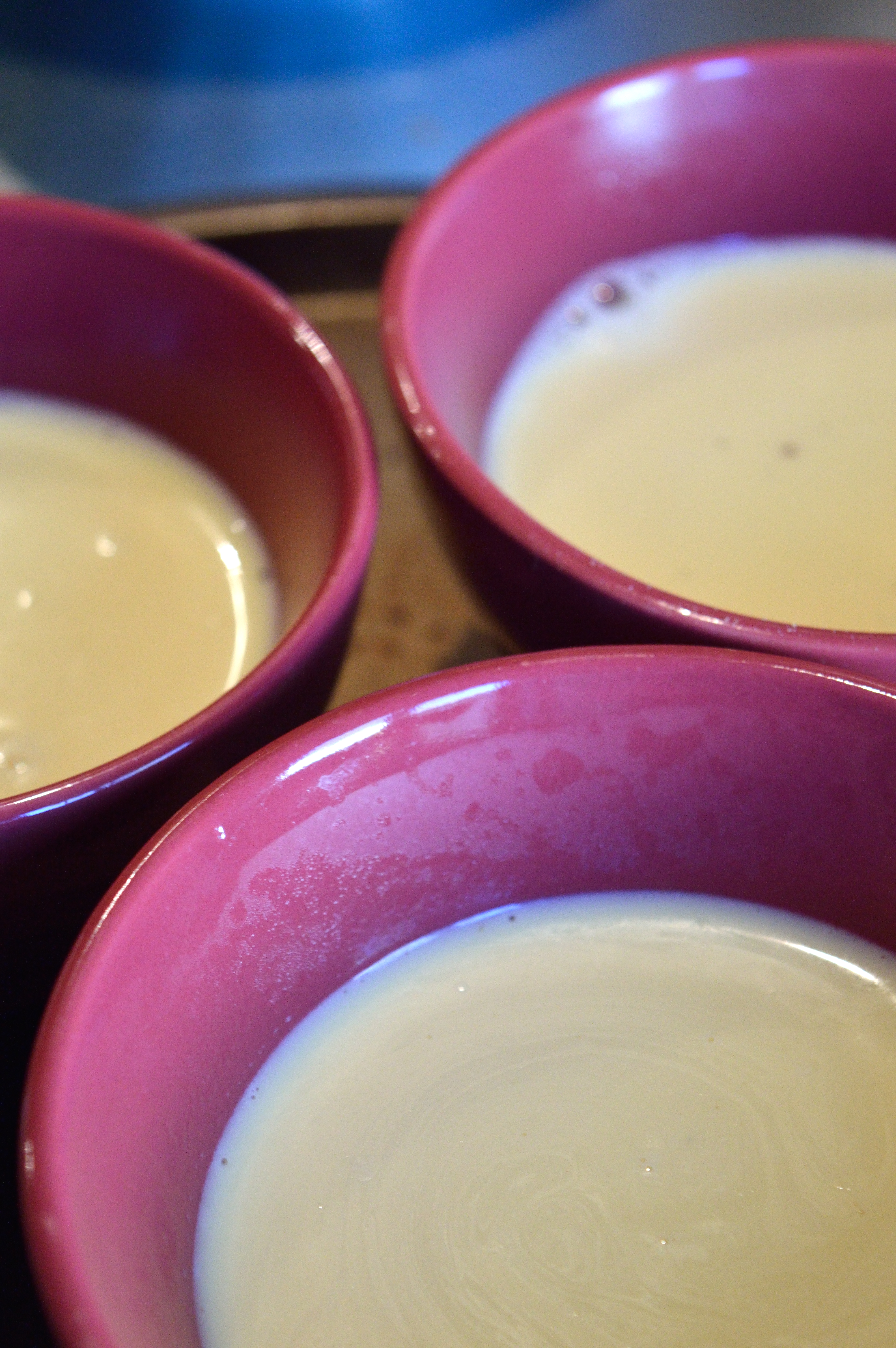 Pour carefully into pretty little (very little) bowls or glasses. No-one is truly arsed un-moulding anything, least of all panna cotta, so just trust me and pick a nice bowly thing. It’s also easier to have the bowls on a tray or plate so you can lift them into the fridge without spilling them. Now do that. Put them in the fridge.