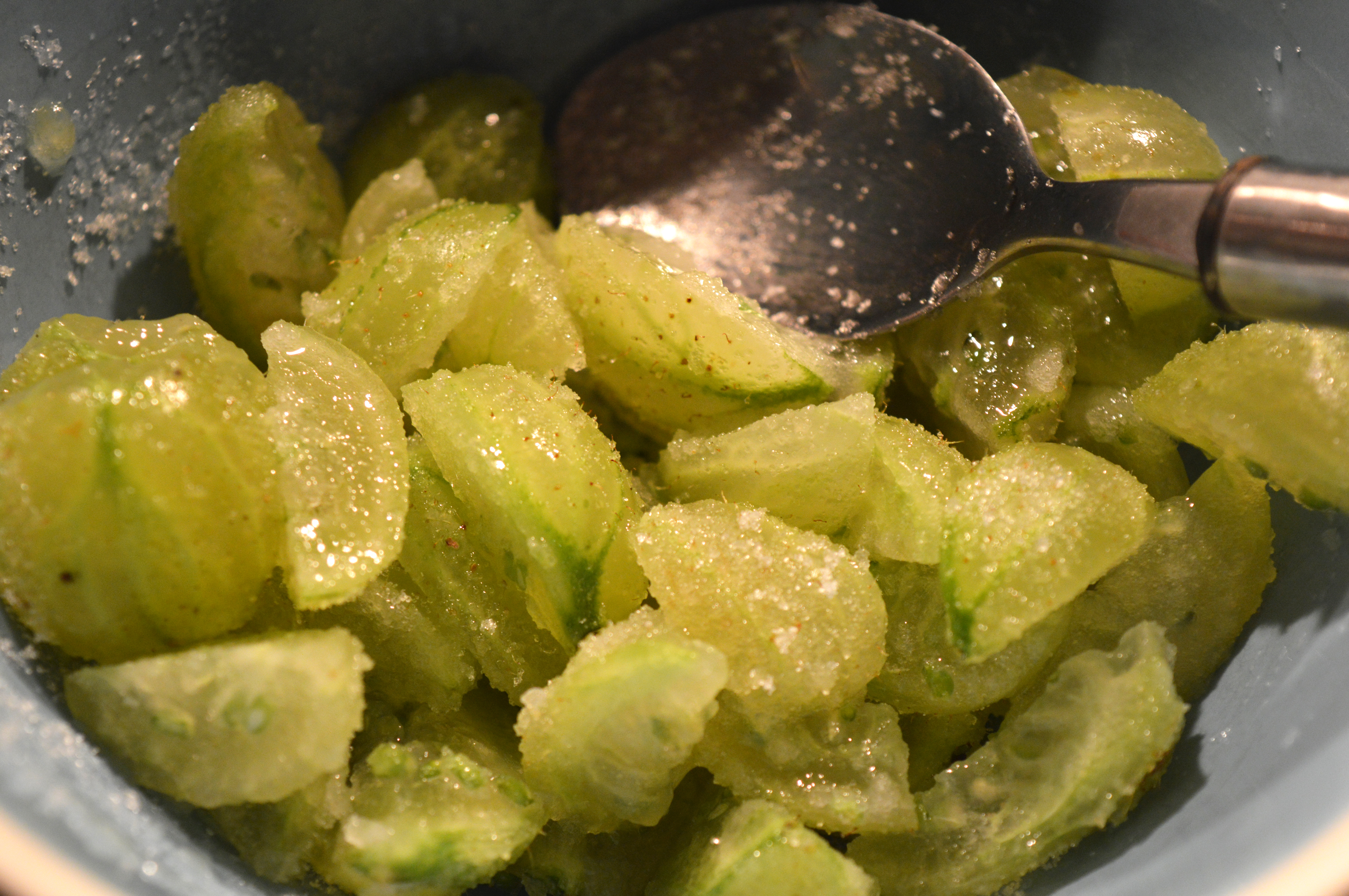 Chop the gooseberries into about eighths or which ever little division you want. Pop them into a bowl with the tablespoon of sugar and stir. Leave to one side while you do the rest.