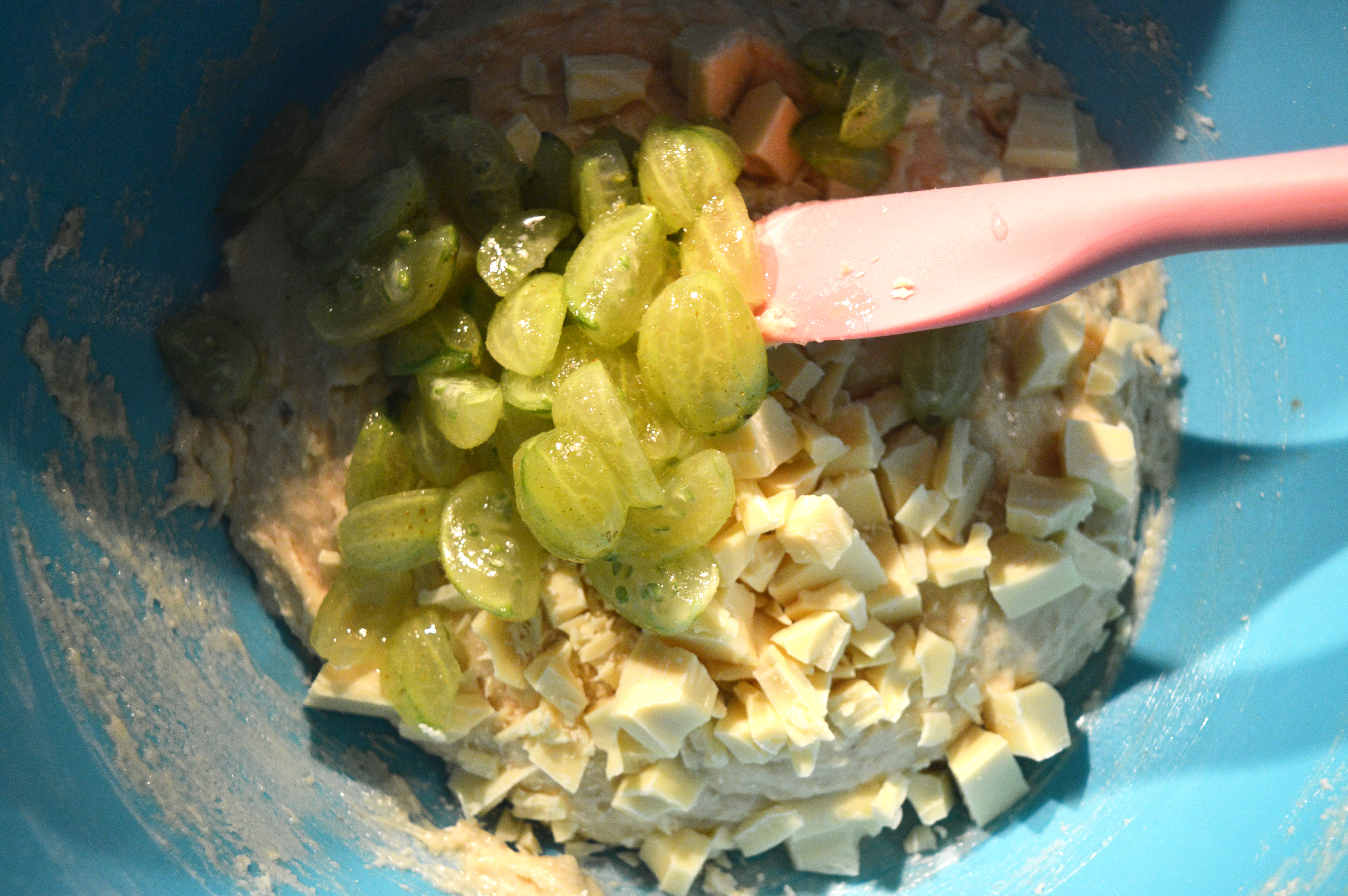 Now, add the milk/egg/butter liquid to the flour bowl and stir well. Tip in the sugared gooseberries (and any liquid from that bowl) and the white chocolate chunks. Fold everything together and dollop it out into your prepared bun cases.