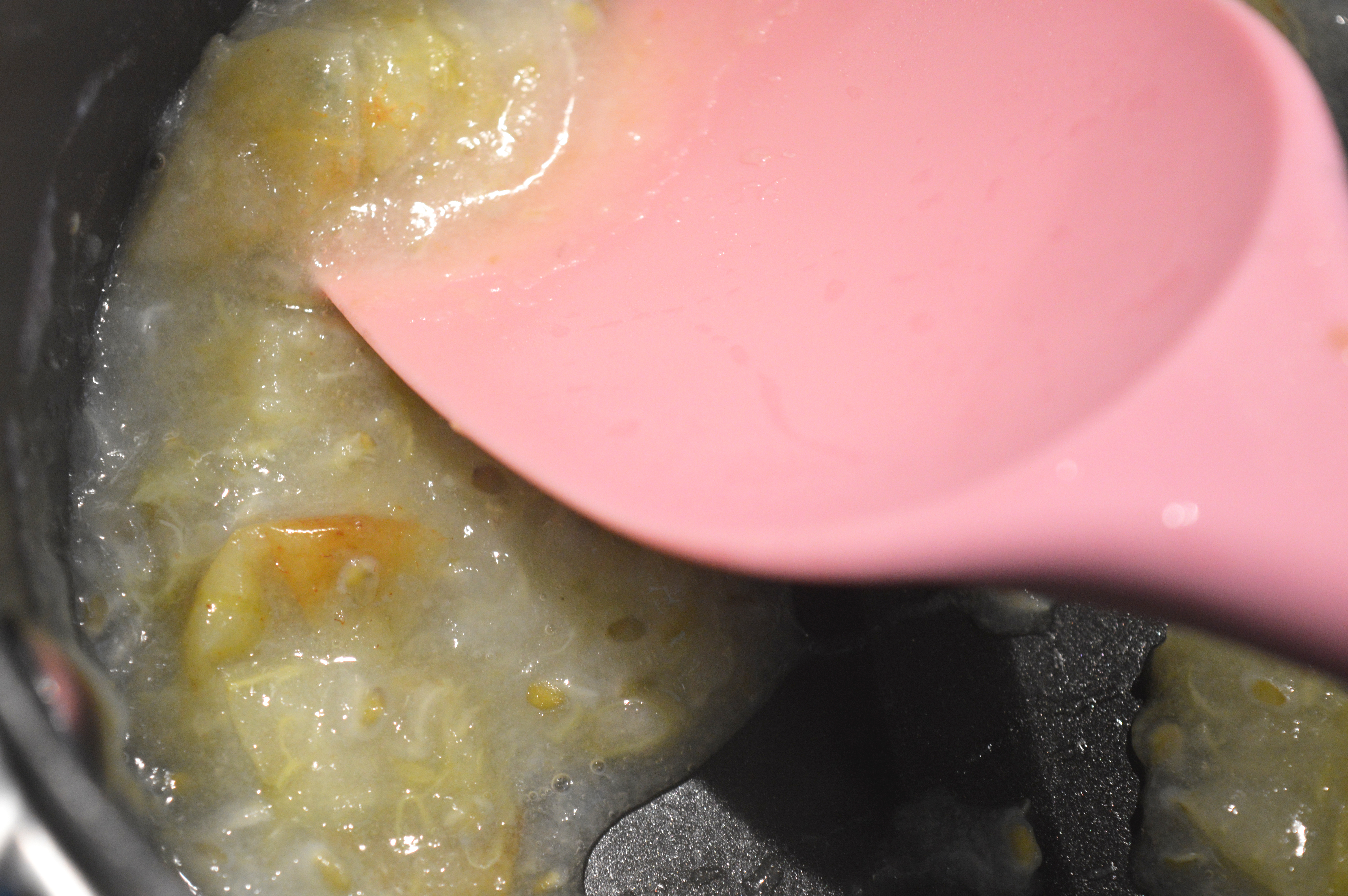 Chop your seven remaining gooseberries into quarters and pop in a small pan. Add a tablespoon of water and heat till they become squishable. Strain them through a sieve to get a smooth gooseberry puree.
