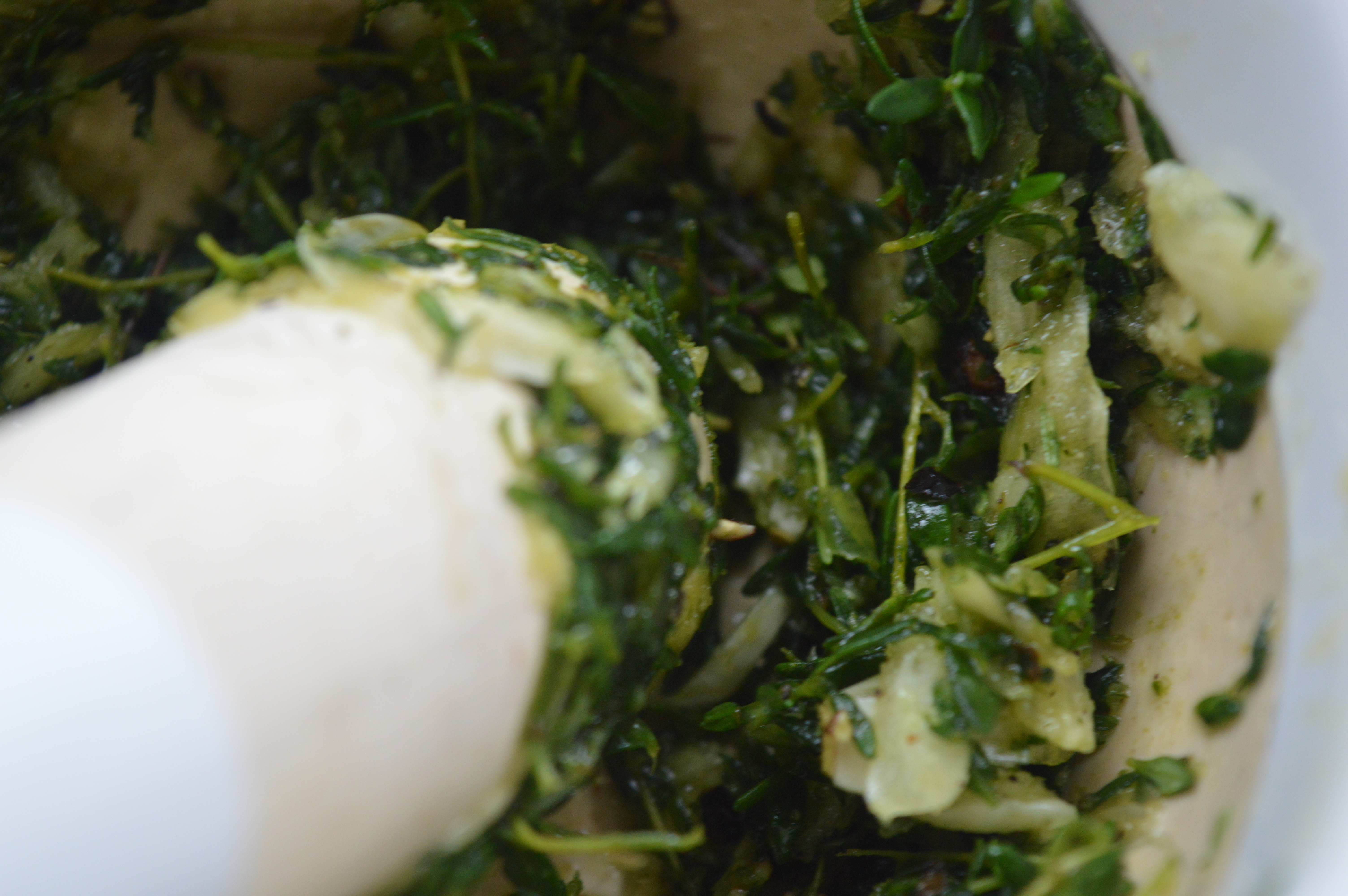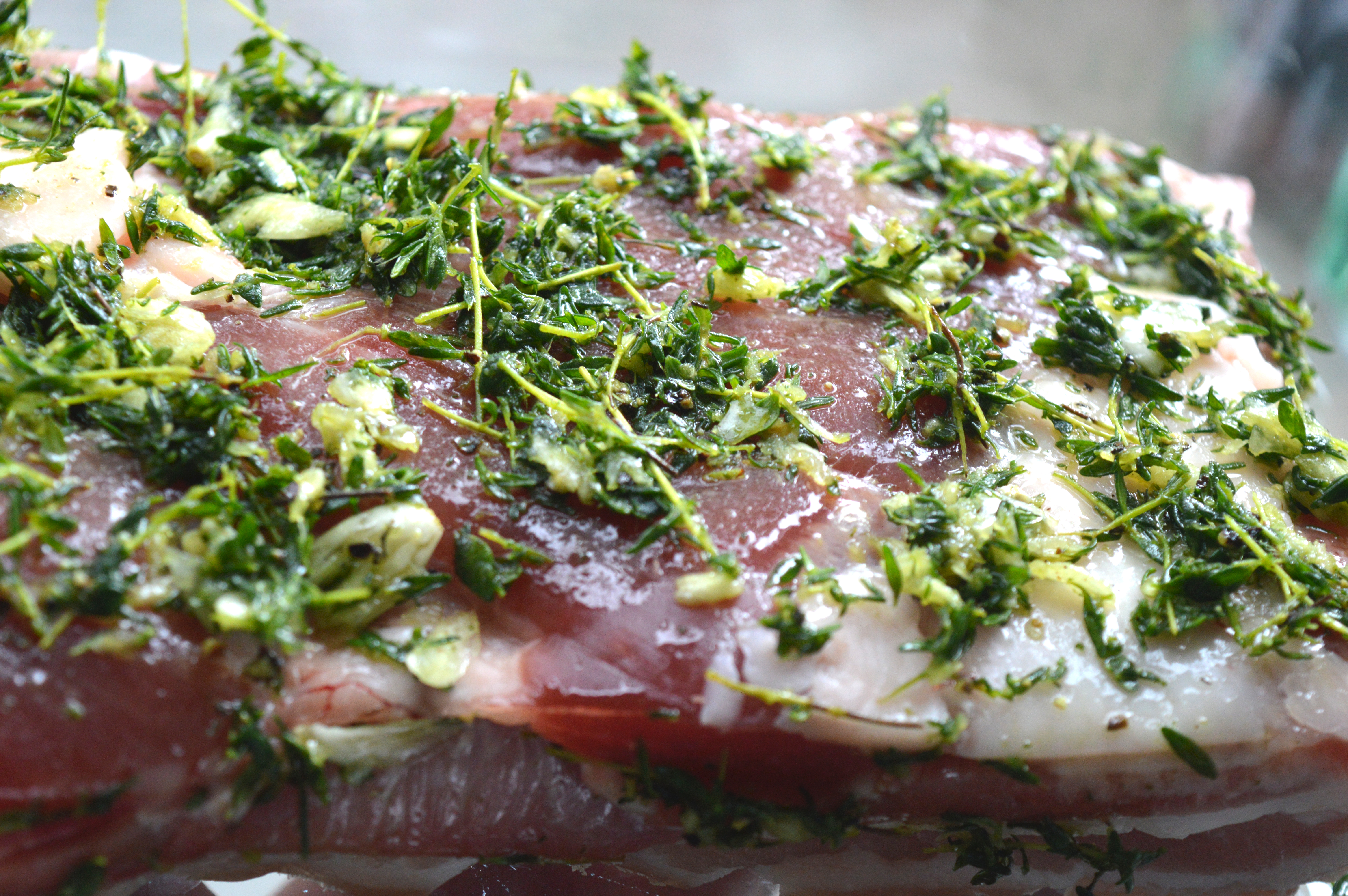 Now flip it over and scoop your herby marinade onto the meaty side. Cove as much of the meat as possible, then wrap the hunk in cling film and place in a bowl. I let mine marinade, unrefrigerated, for about 2hrs and it was plenty.