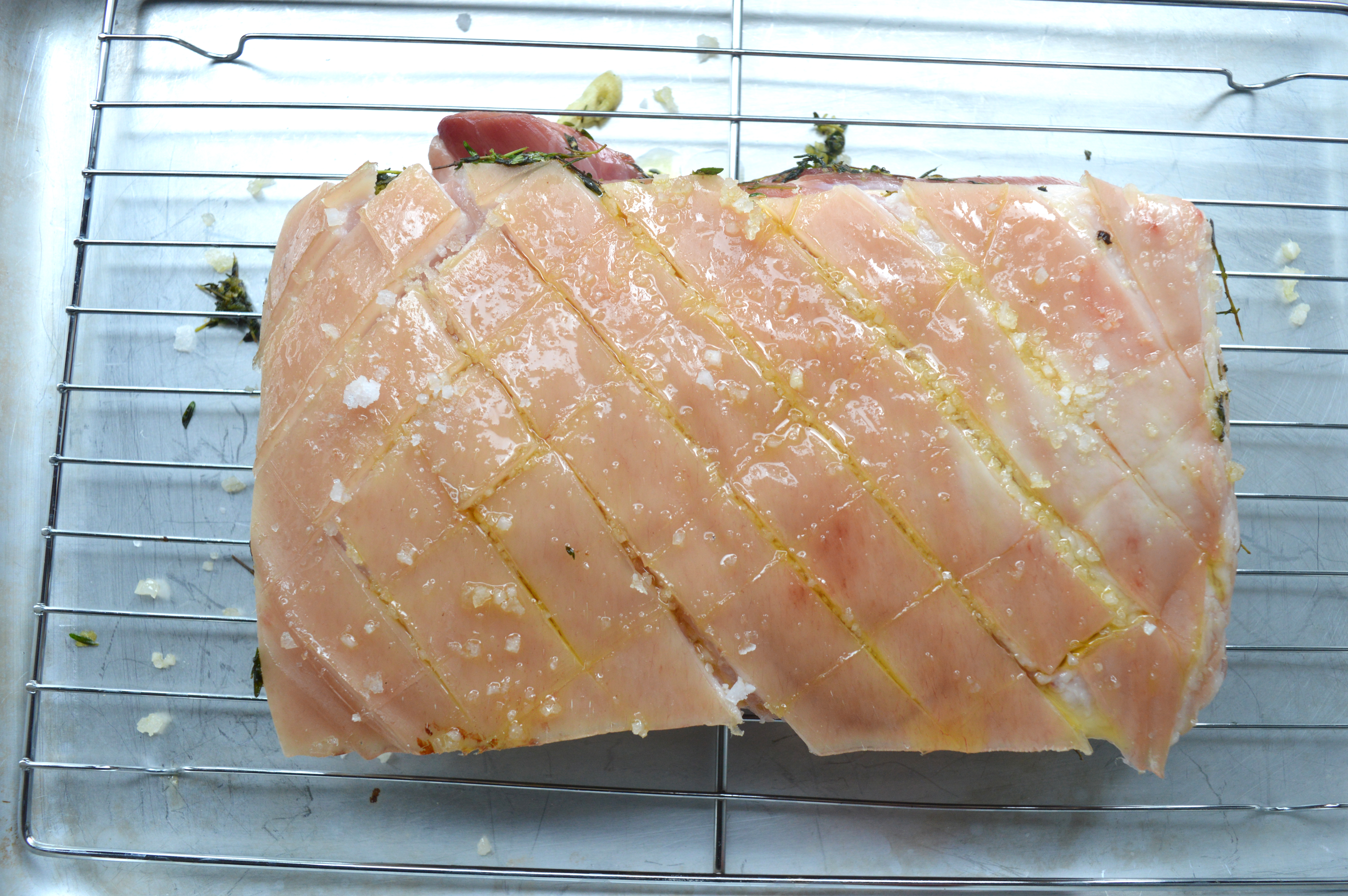 Score the skin side of the pork belly into diamonds, look at the photo.