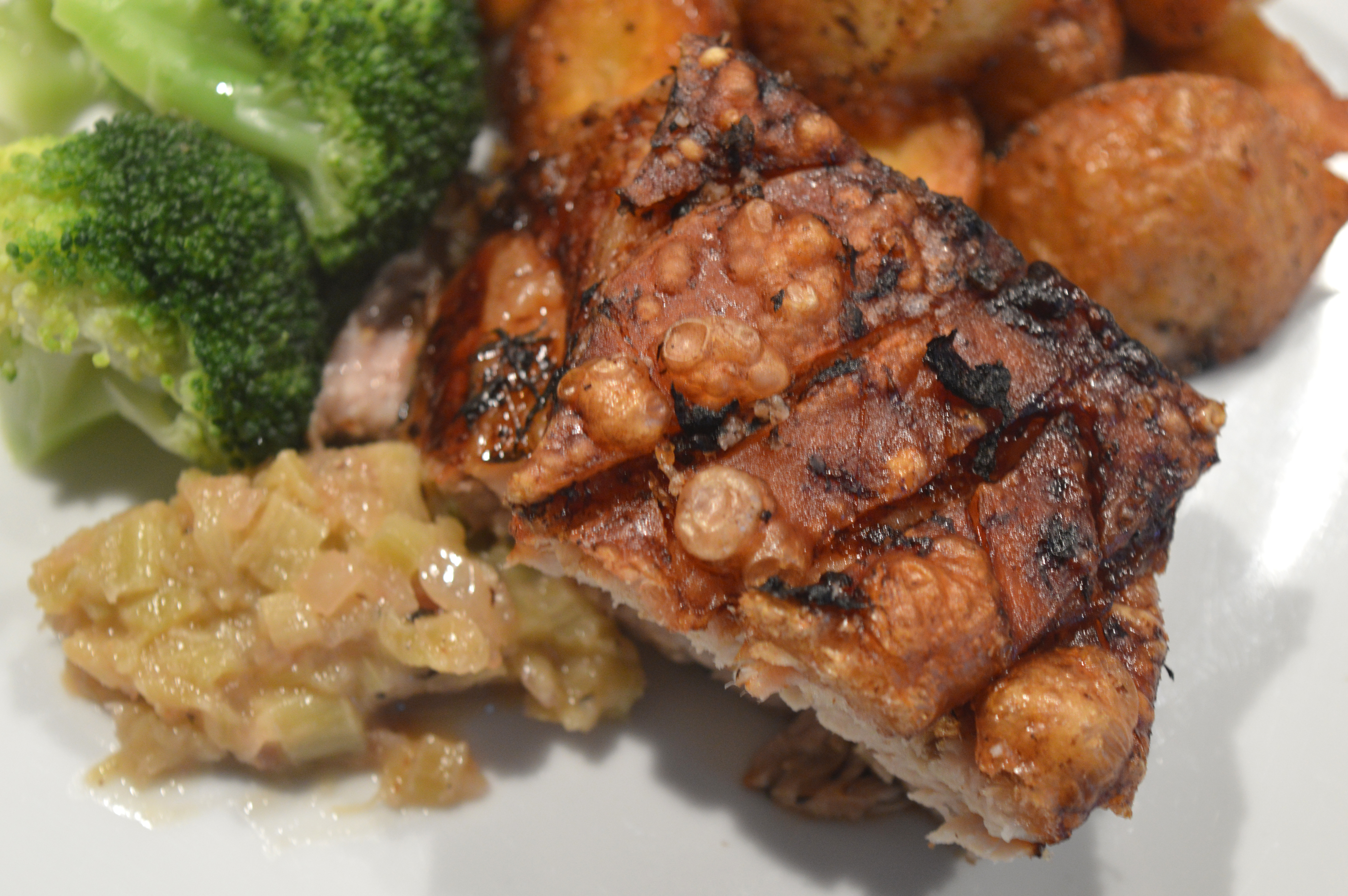 You should now have cringingly crispy crackling and succulent meaty goodness beneath. Serve with a wedge of lime and anything else you fancy, I went for roast potatoes, blanched broccoli and a rhubarb compote.