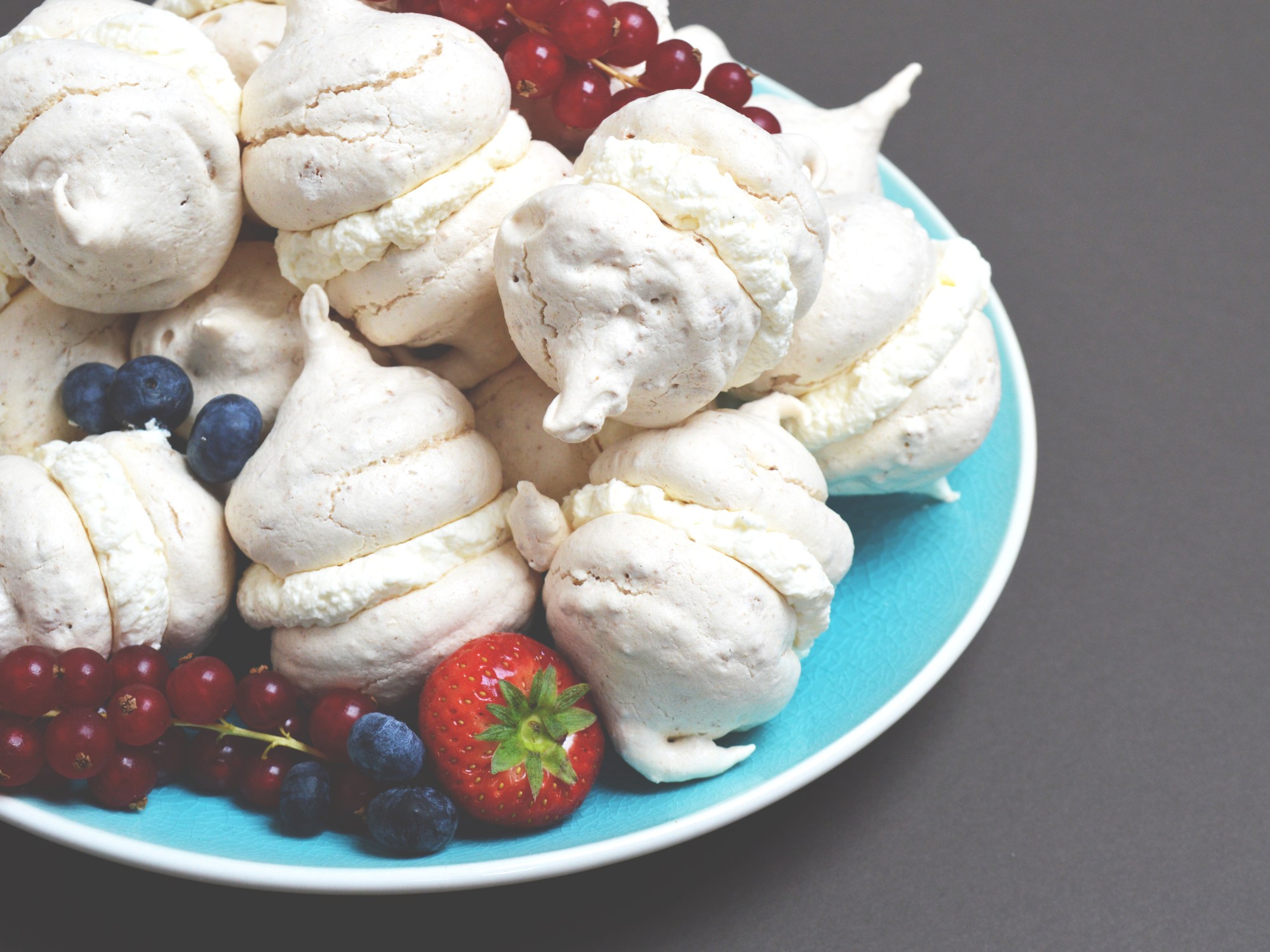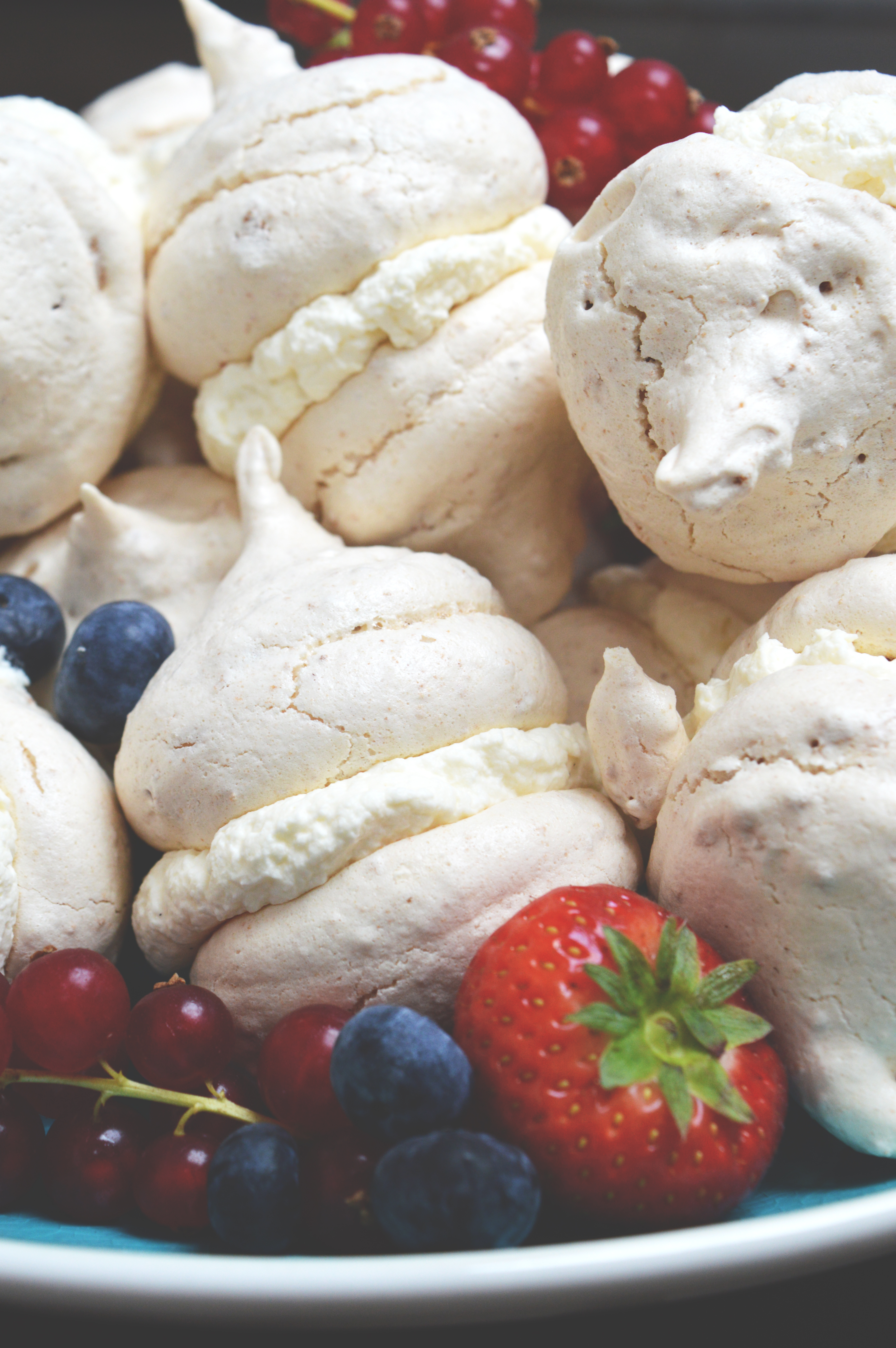 When the meringues are cool, pipe or spoon a dollop of cream onto the flat side of one meringue and squish a second meringue, flat side first, into the cream. There you go. A fairly delicious looking dessert with hardly a sweat broken.
