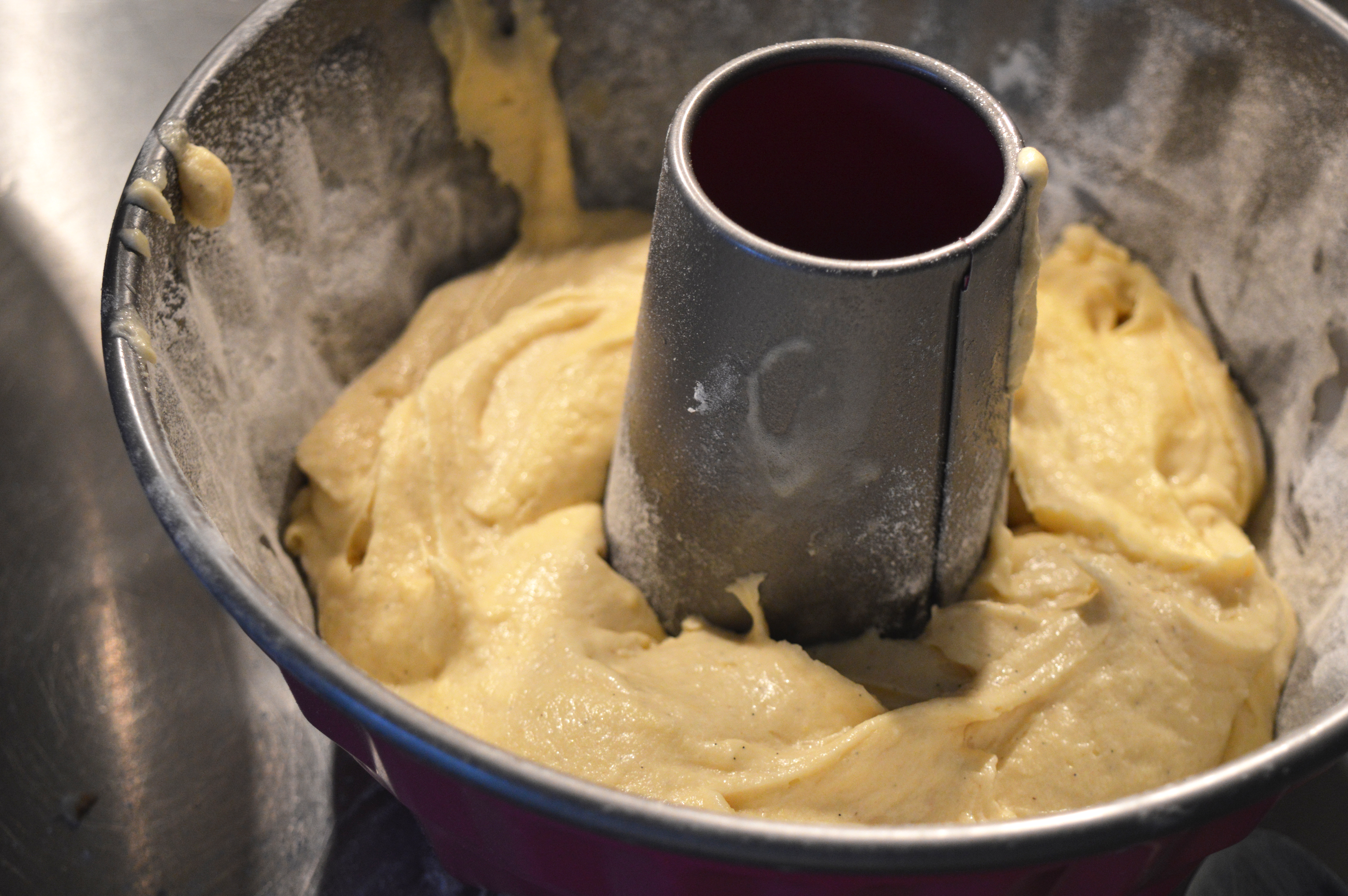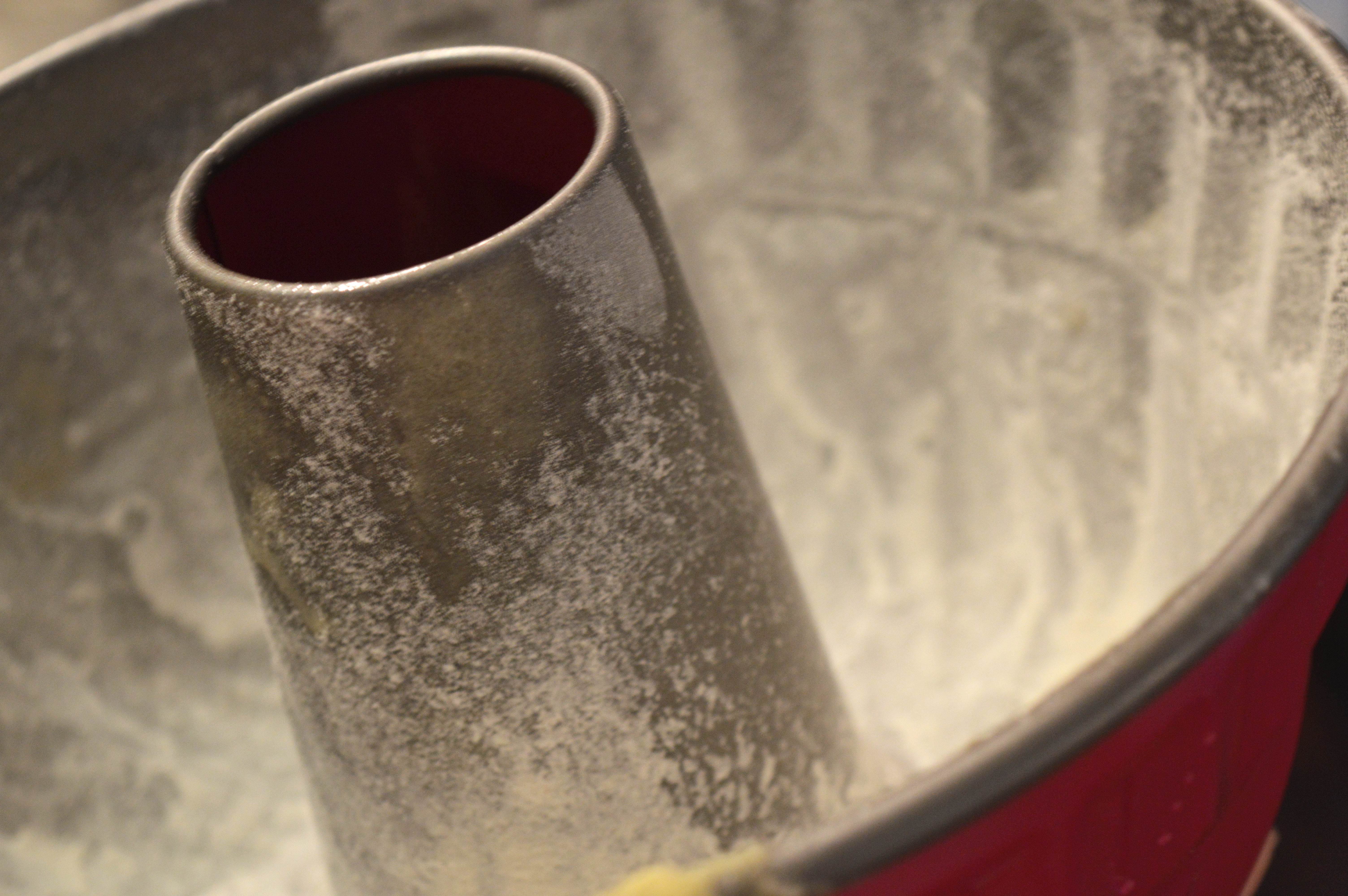 Preheat the oven. Find a bundt tin. If you fail to possess such a thing then just pick a nice 20cm round tin. Whichever vessel you’re using you’ll need to grease and flour it. Then put it to one side.