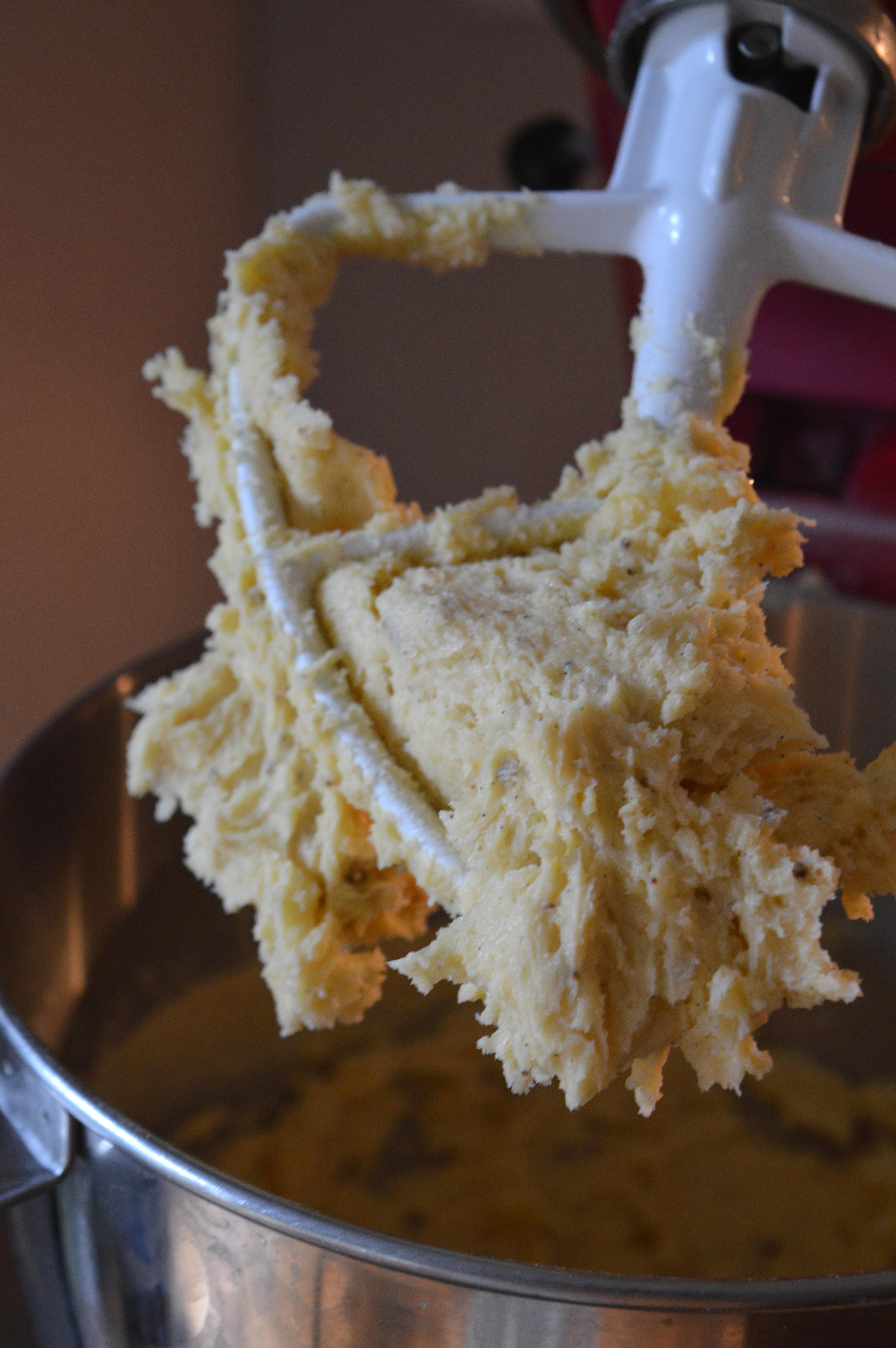 As per usual this is a scandalously straightforward recipe. Place the softened butter into a big mixing bowl and add in the sugar and vanilla extract. Beat well to combine, most easily done with electric beaters.