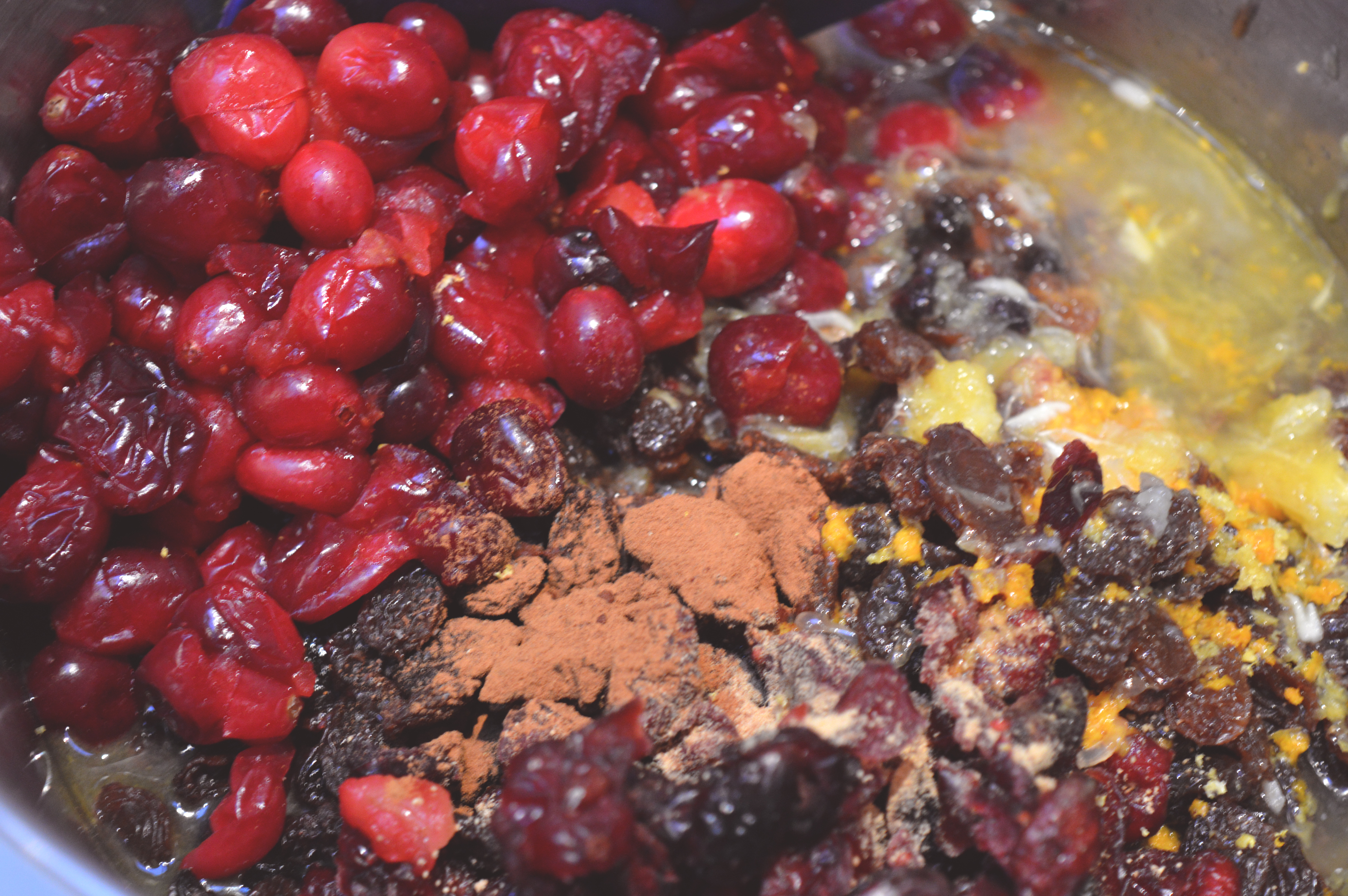 When the fresh cranberries have popped put them into the mincemeat too and mix everything together. The smell is ridiculously festive and makes the fiddliness worthwhile. If you think your mix is too wet add in some more dried fruit and let it sit for half an hour. Also, feel free to add in some alcohol if you fancy.