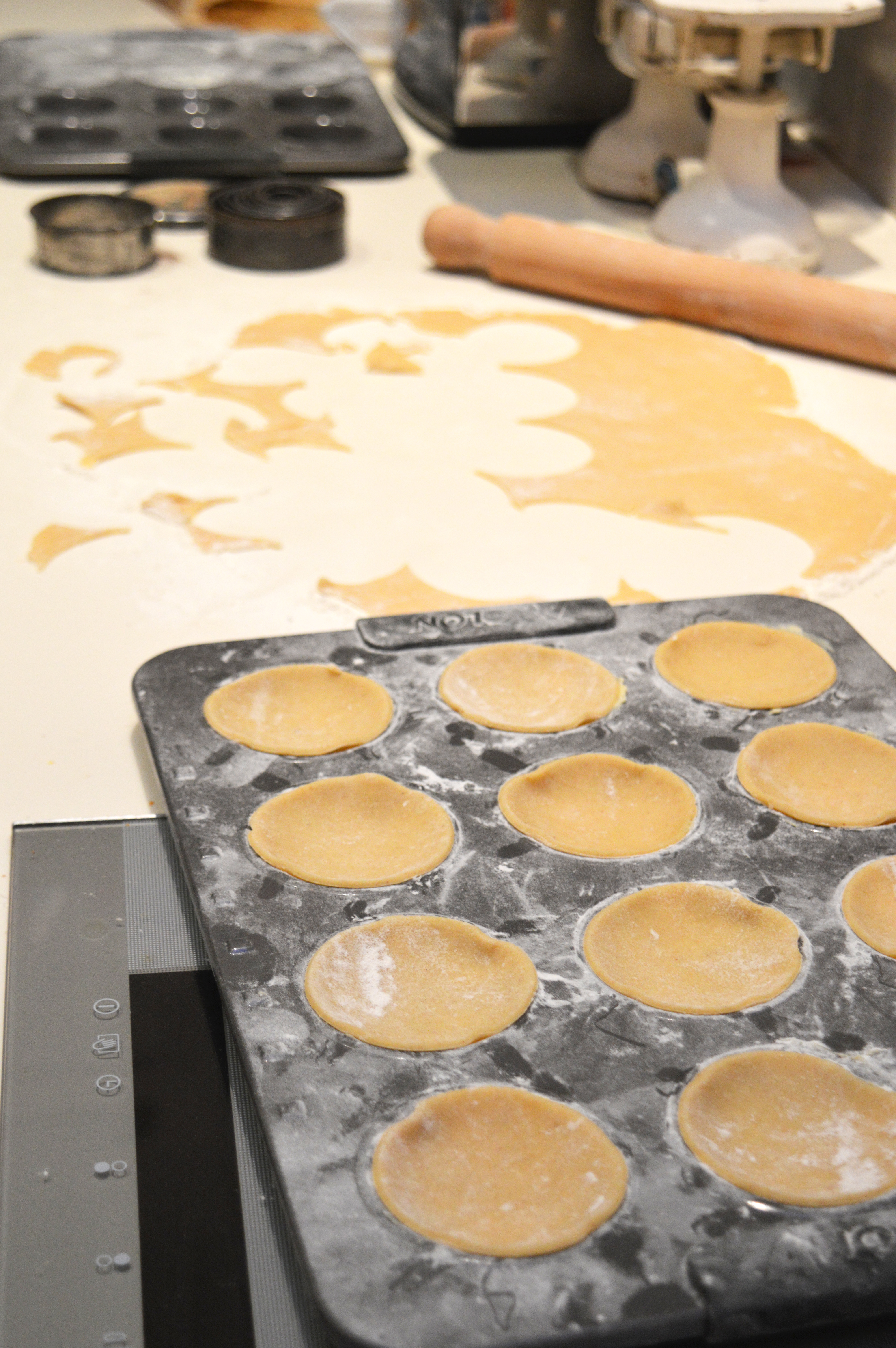 Cut out the 18 bases first. Lift them gently onto the bun tray and very gently push them into the tray. Once you’ve filled a tray with pastry bases put it in the fridge while you do the other bits.