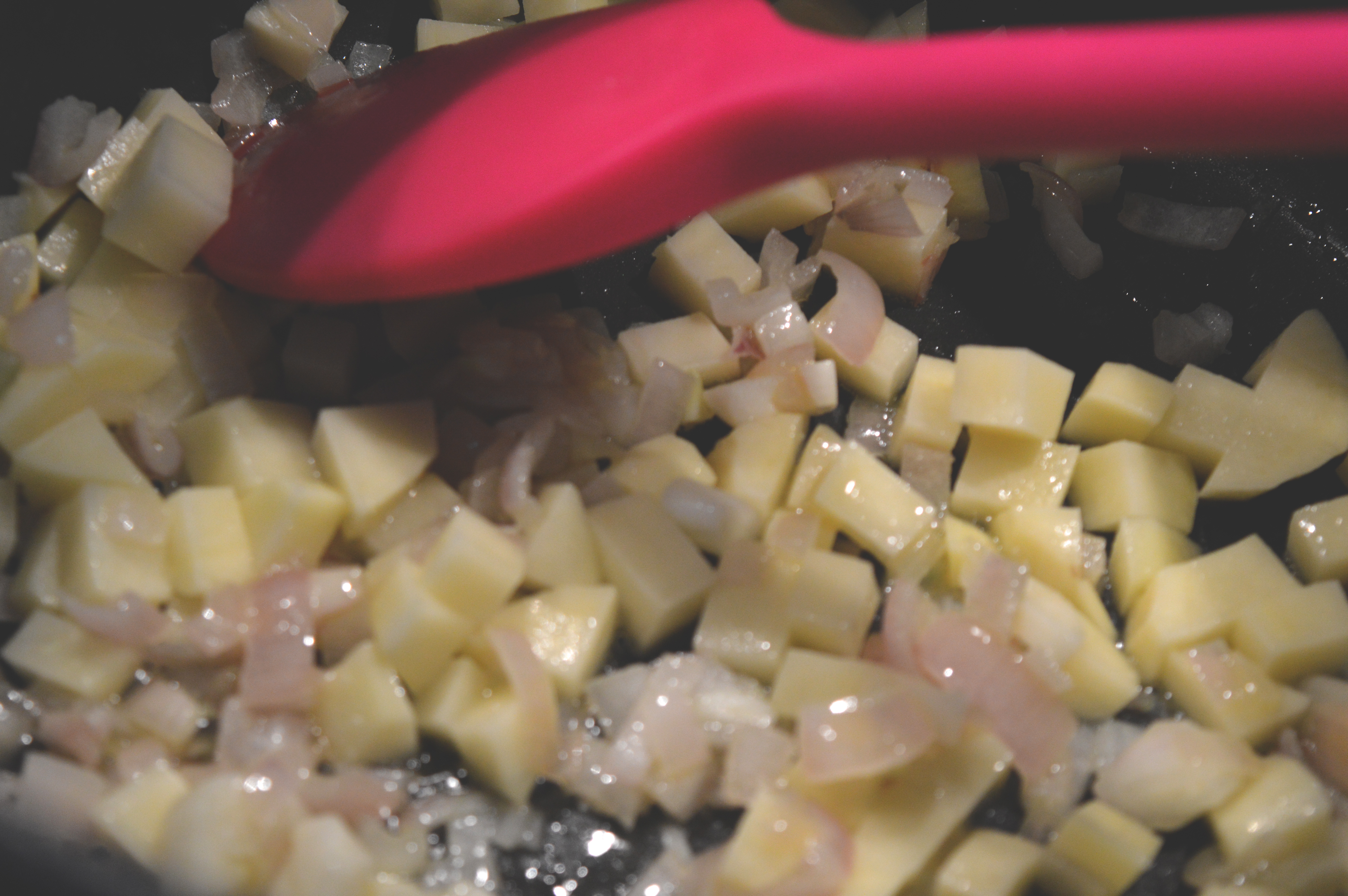 Dice the shallots and pop them in a large saucepan with a knob of butter then crush in the garlic. Put the pan on a medium heat and let them fry away, gently, while you finely dice the potato. I say finely, by which I mean 1/2cm cubes, but the size is only to reduce cooking time. The bigger the potato the longer it’ll take to soften. Anyway, pop the potatoes in with the shallots.