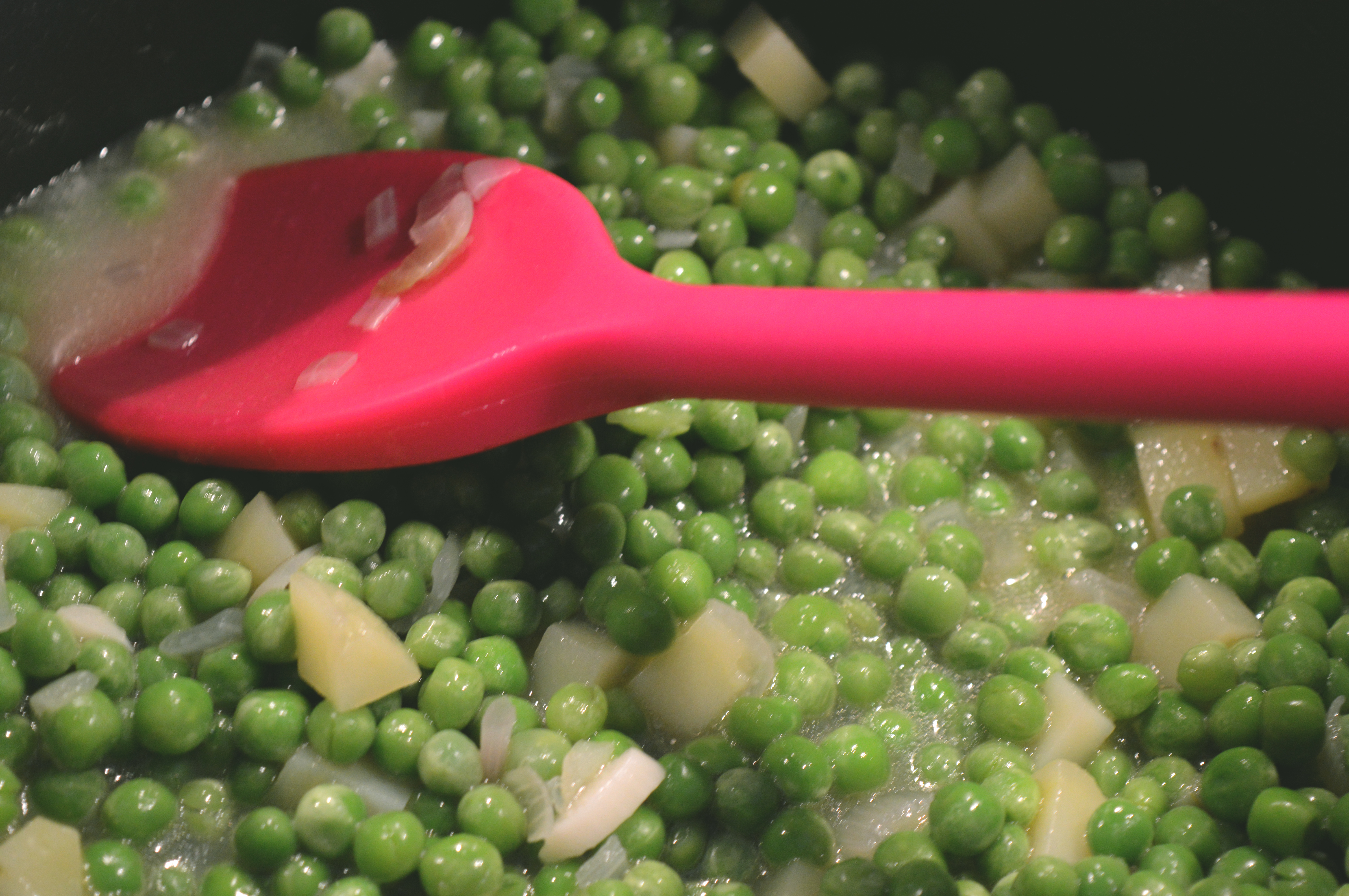 When the potatoes have softened then tip in the frozen peas. You don’t necessarily want the peas to cook, just to heat through, so they stay nice and fresh.