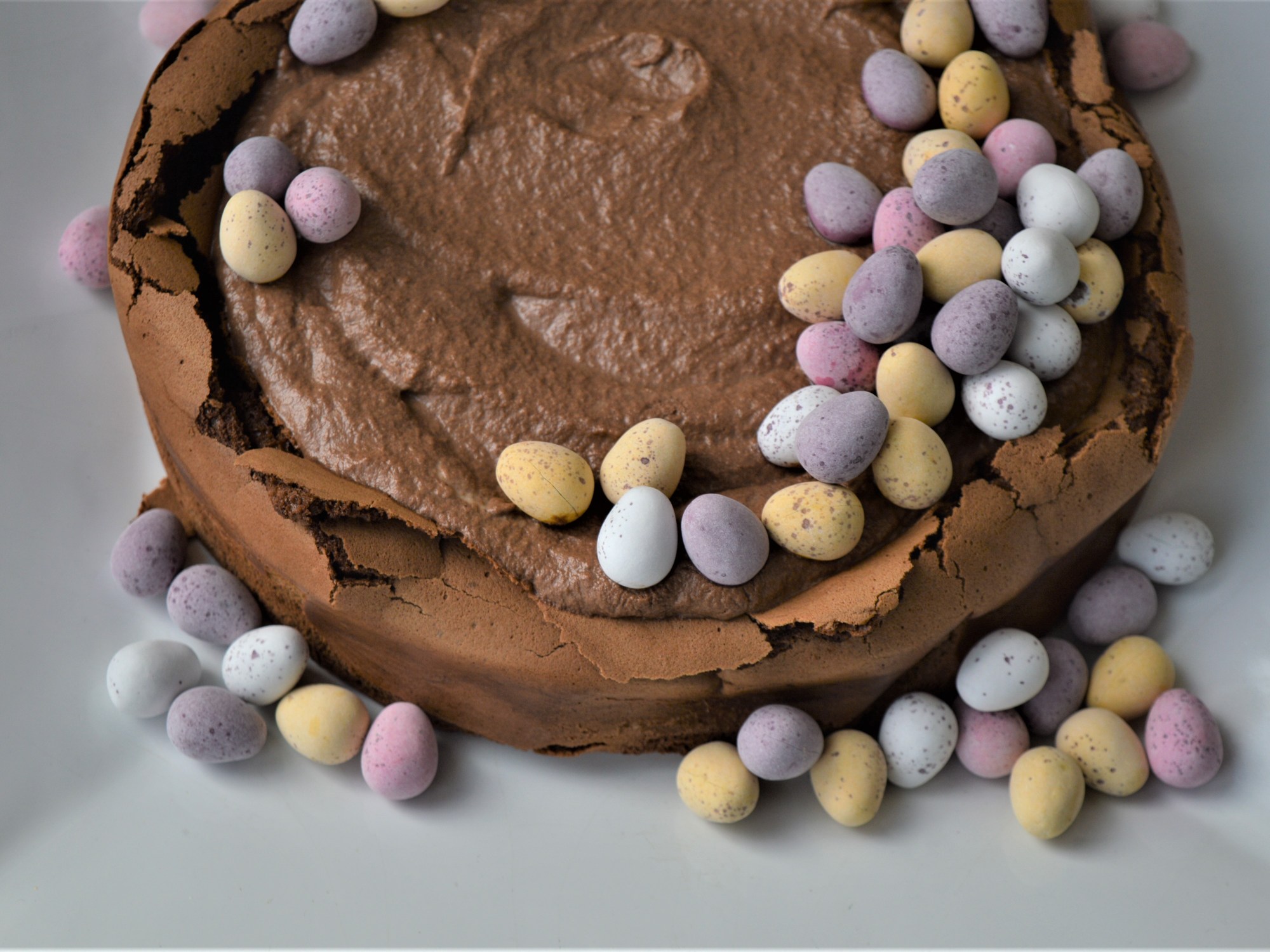 I seem to be more than fond of an old flourless chocolate cake. So here we have an Easter themed chocolate cake from the cake deity Nigella. This one, however, is even lighter than my standard torte. We’re heading into almost healthy territory here, the cake doesn’t even contain nuts. It’s also marvelously easy to make for the relative deliciouslness and falls somewhere between a brownie and a fluffy thing.