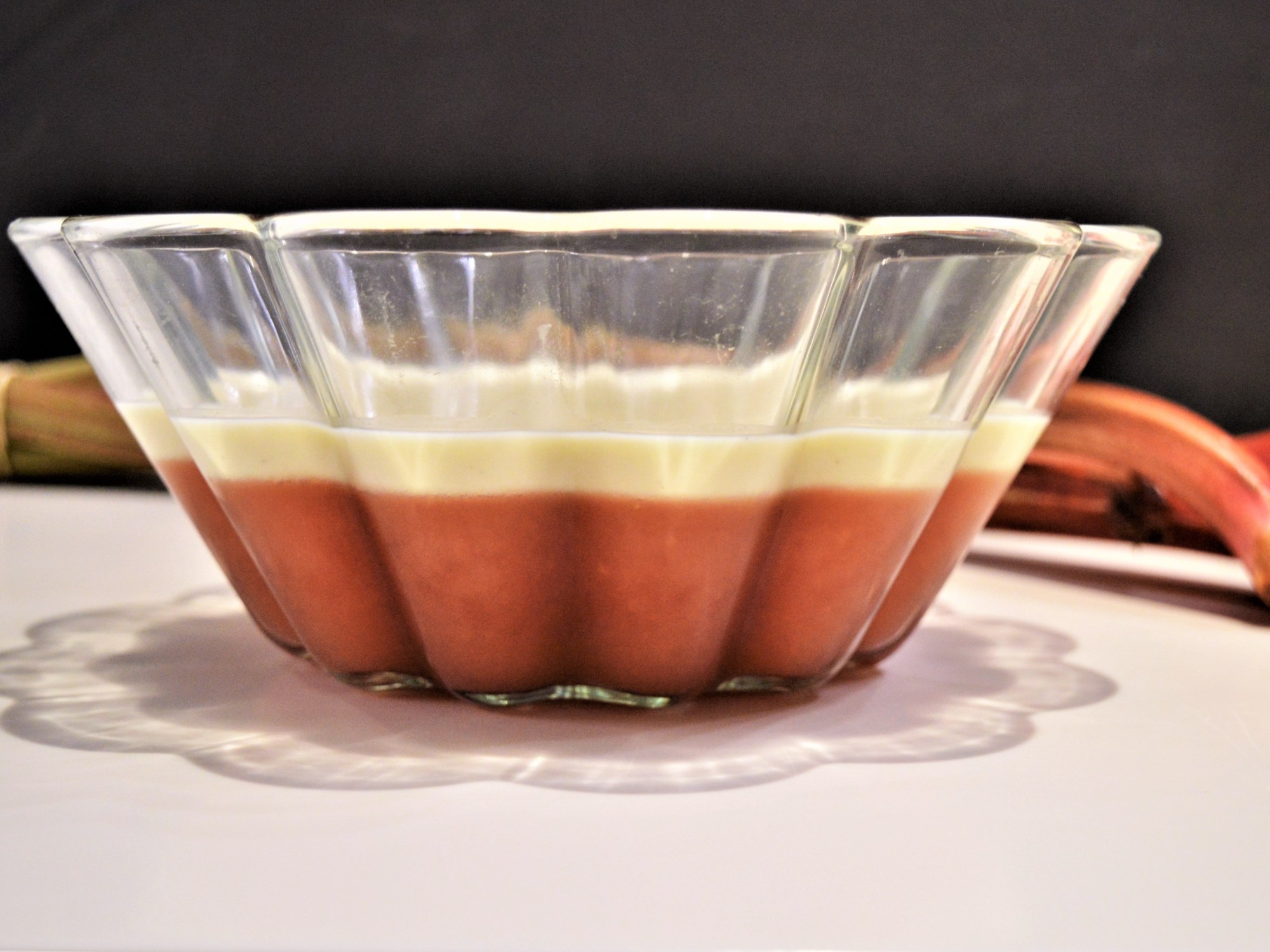 Let it cool down before pouring it onto the rhubarb jelly, then put the whole bowl of yum into the fridge.