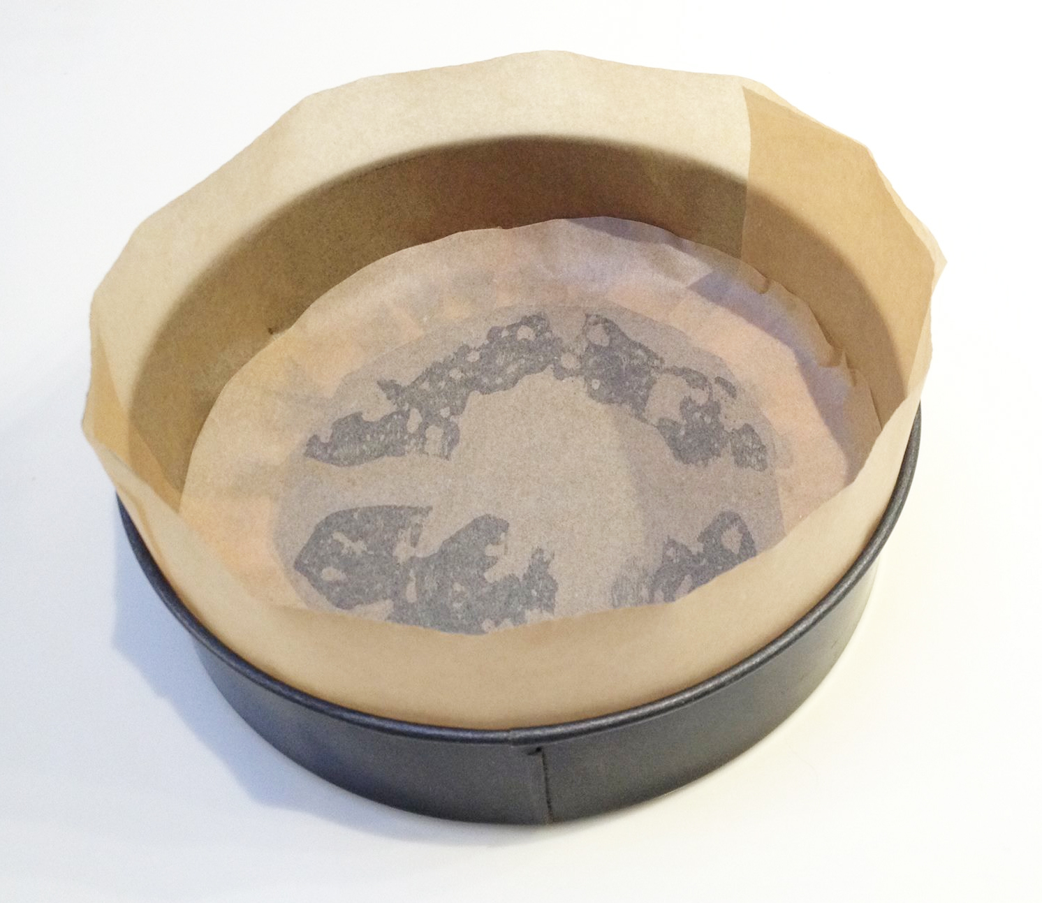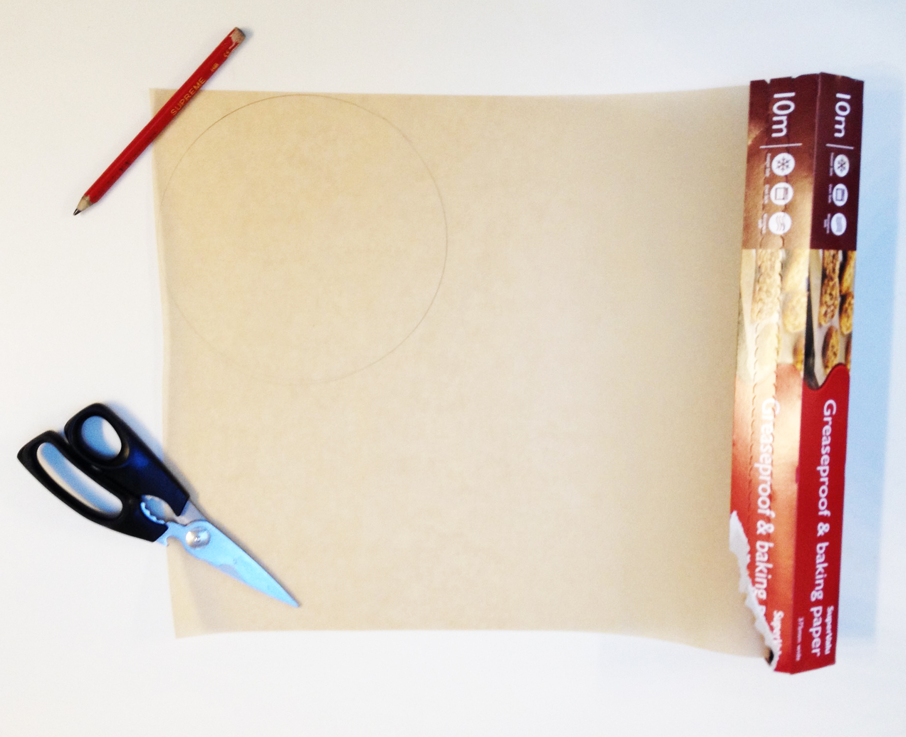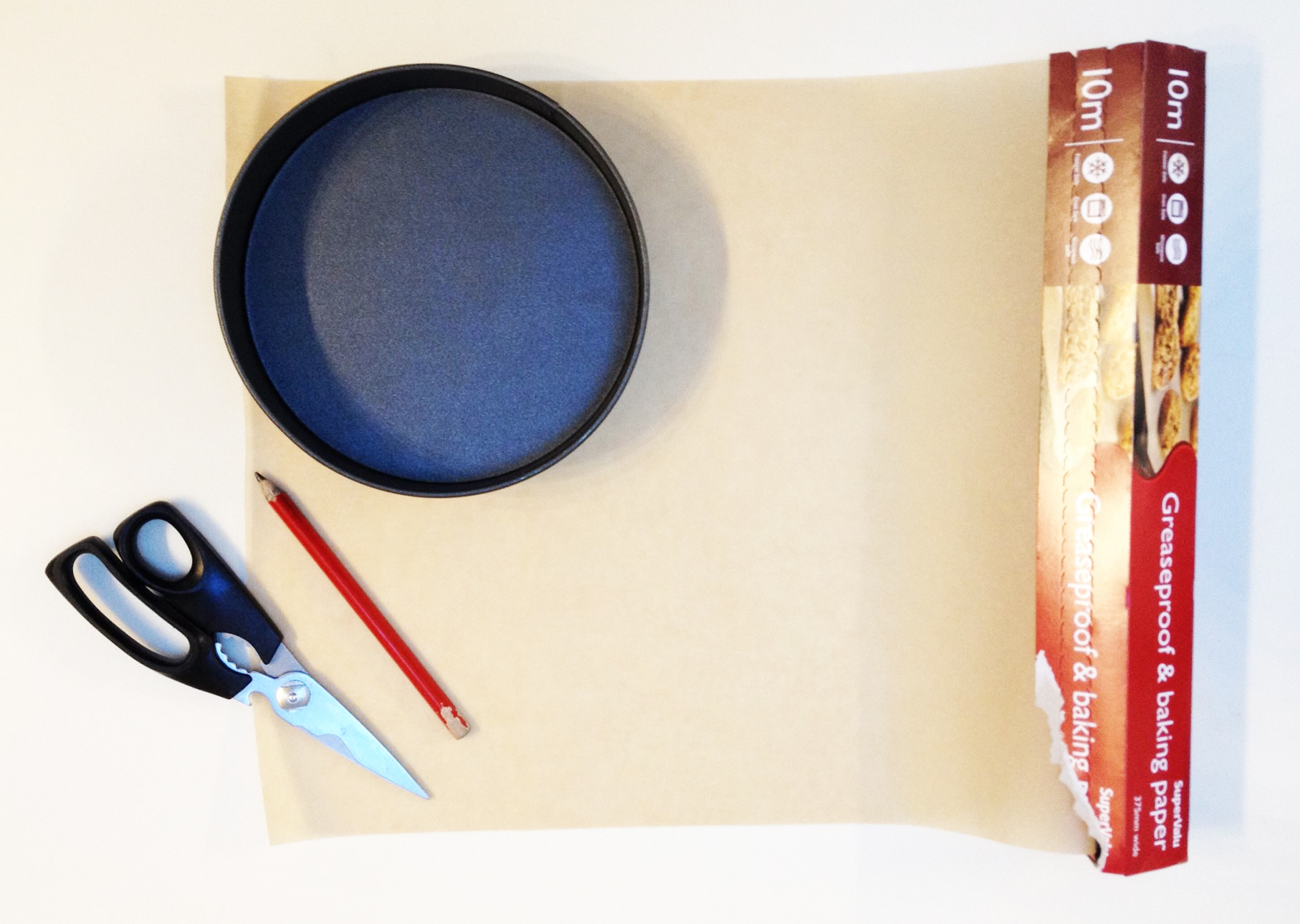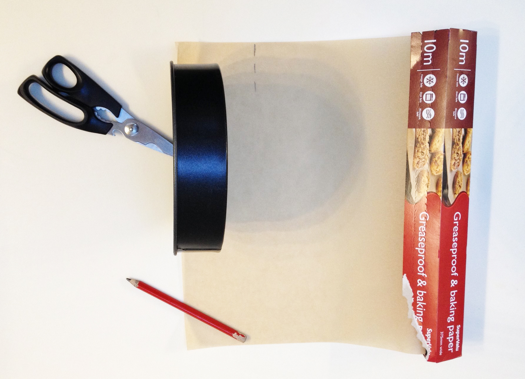 Get out your baking parchment. Put your tin of choice on the edge of the parchment. Use a pen/ writing implement to draw the outline of the base. Cut out this circle and put to one side.