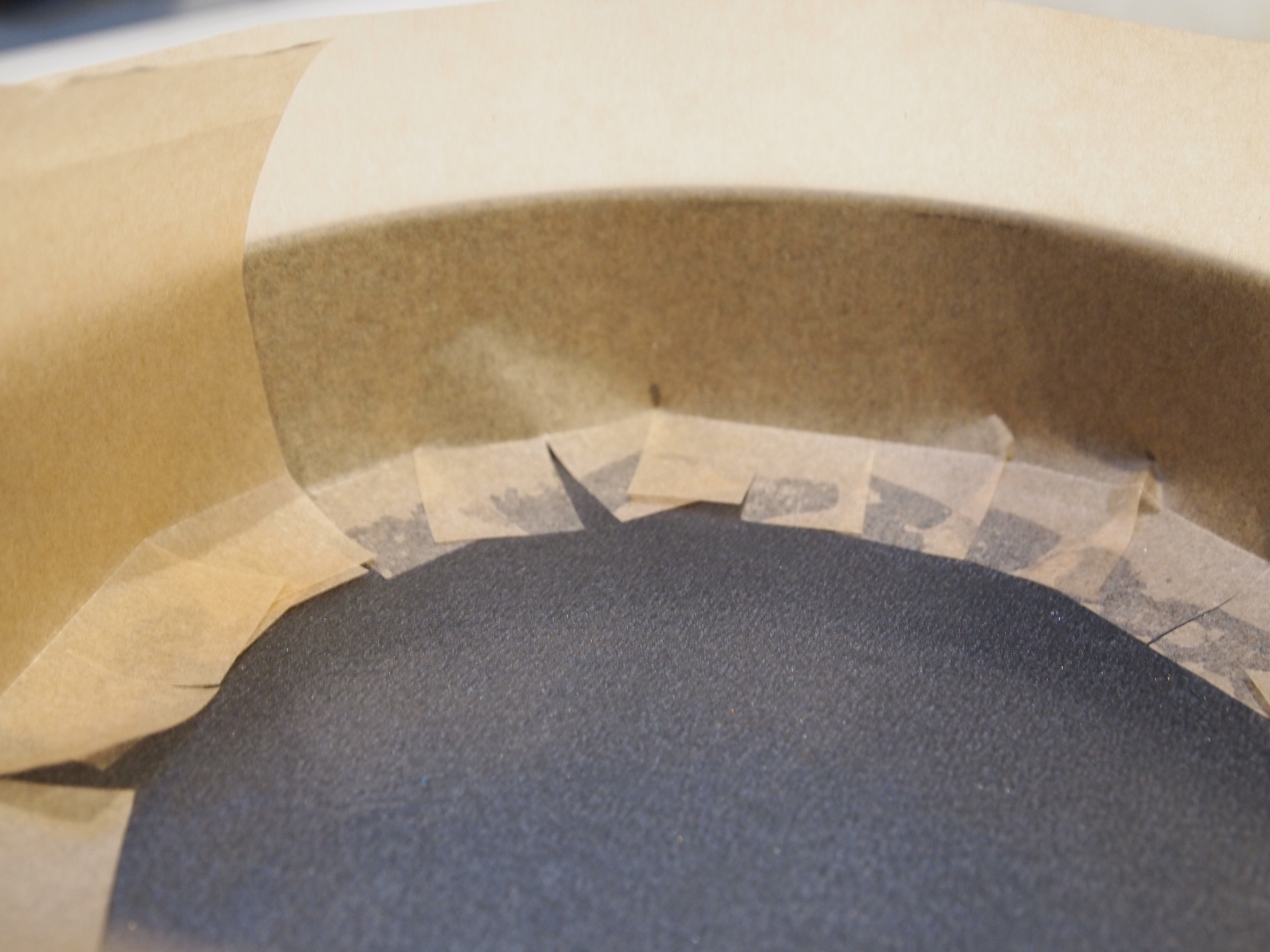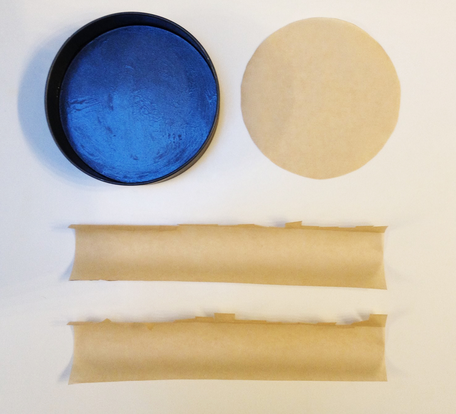 Smudge a small amount of butter/ oil/ fancy non-stick spray on the inside of the tin. Put your strips, frilly side towards the base of the tin, into the tin so the frills are facing the centre. Next, place the circle of parchment on top.