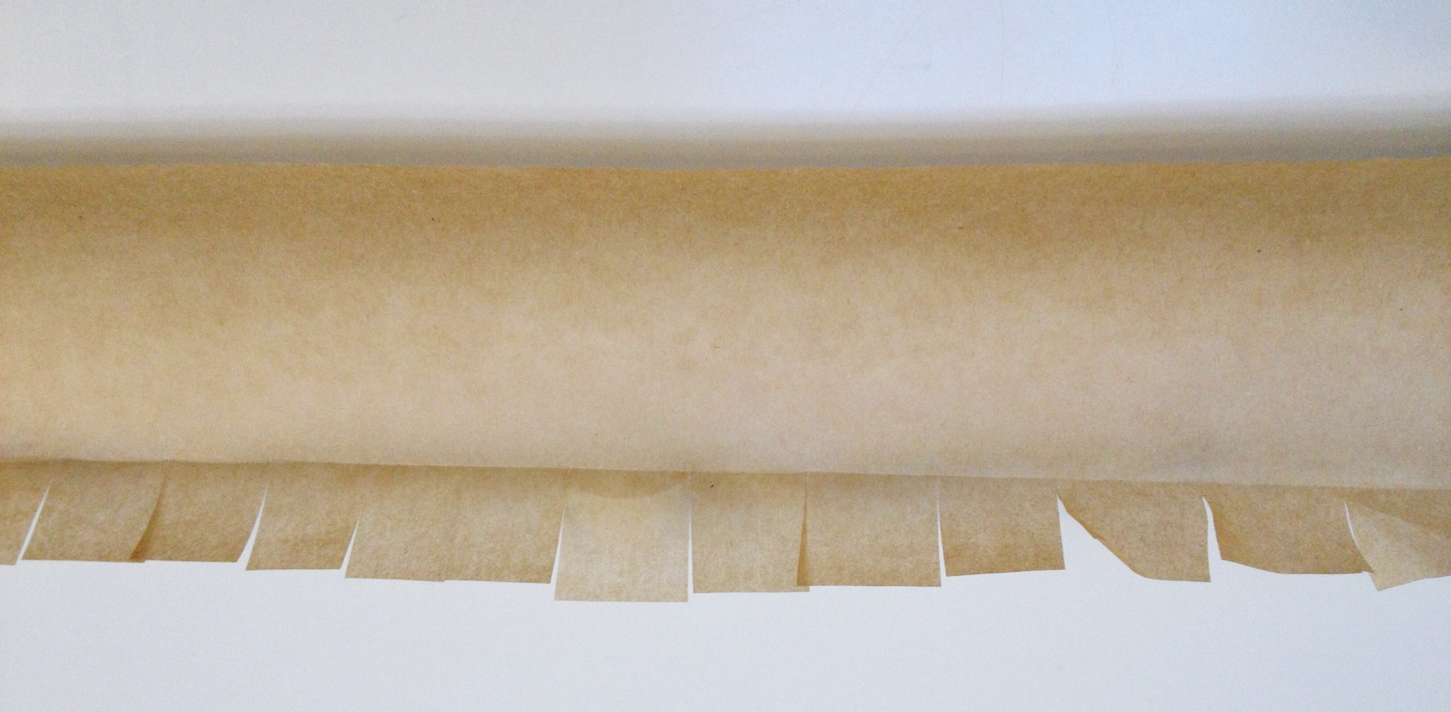 Take your long parchment strips and make a fold about 3cm from one edge along the vertical axis. Make cuts along the narrow edge as far as the fold, about 3cm apart (see above). No need to be too exact.