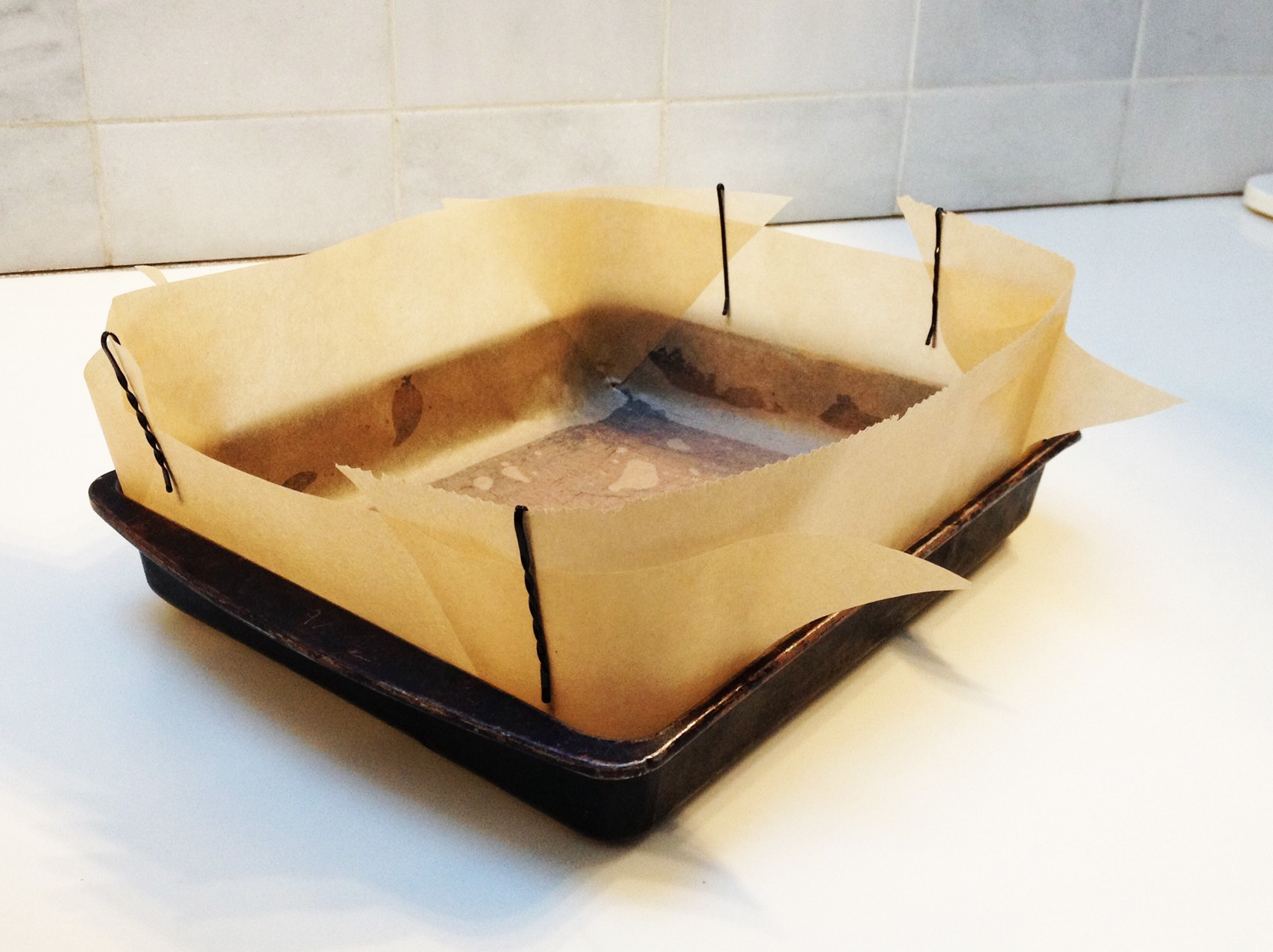 Place the parchment into the greased tin and fold the pointed ends towards each other. Secure these with hair slides as shown. Done.